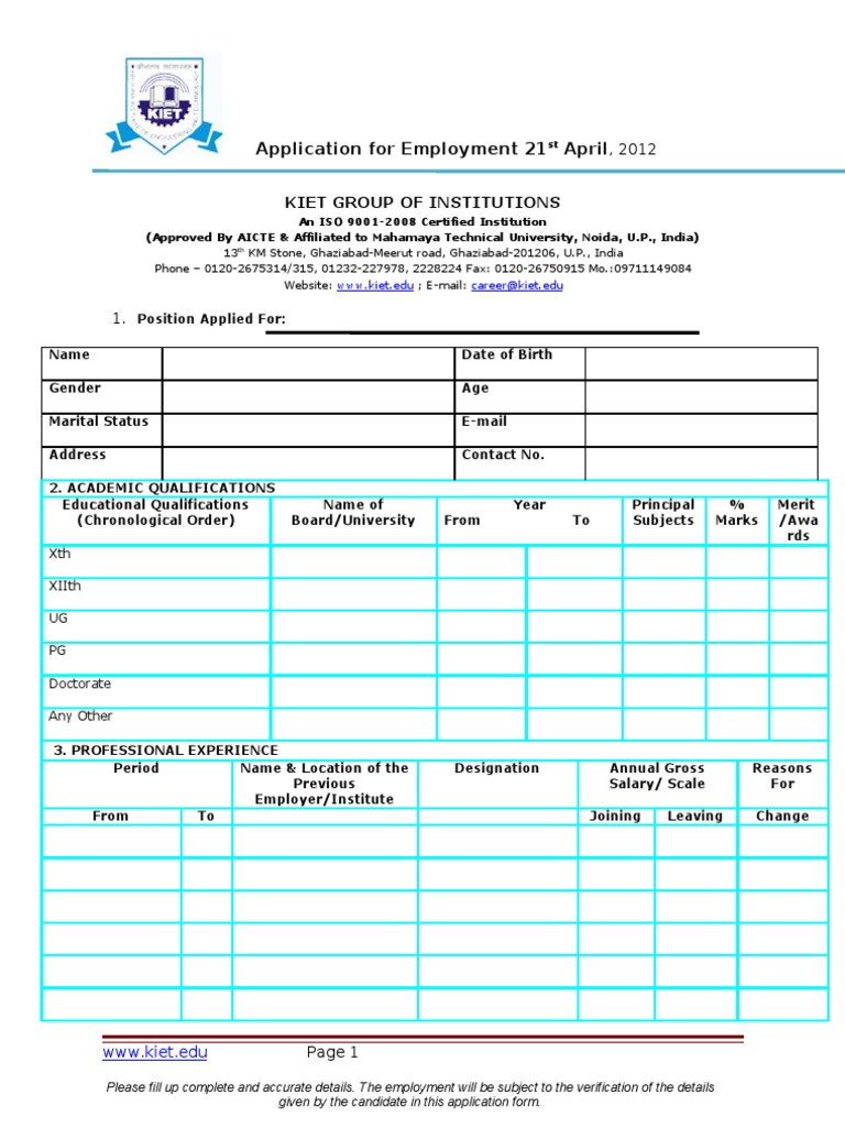 Application for Employment 21st April, 2012
