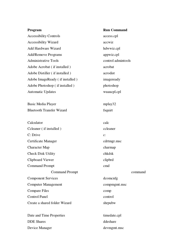 Run Command access.cpl accwiz hdwwiz.cpl appwiz.cpl control admintools acrobat acrodist imageready photoshop wuaucpl.cpl mplay32 fsquirt calc ccleaner c: cdrtmgr.msc charmap chkdsk clipbrd cmd command dcomcnfg compmgmt.msc comp control shrpubw timedate.cpl ddeshare devmgmt.msc
