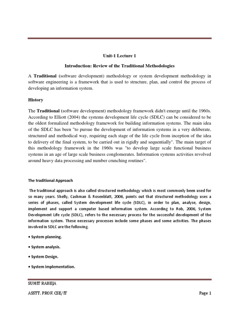 The traditional Approach The traditional approach is also called structured methodology which is most commonly been used for so many years. Shelly, Cashman & Rosenblatt, 2006, points out that structured methodology uses a series of phases, called System development life cycle (SDLC), in order to plan, analyse, design, implement and support a computer based information system. According to Rob, 2006, System Development Life cycle (SDLC), refers to the necessary process for the successful development of the information system. These necessary processes include some phases and some activities. The phases involved in SDLC are the following. System planning. System analysis. System Design. System implementation.