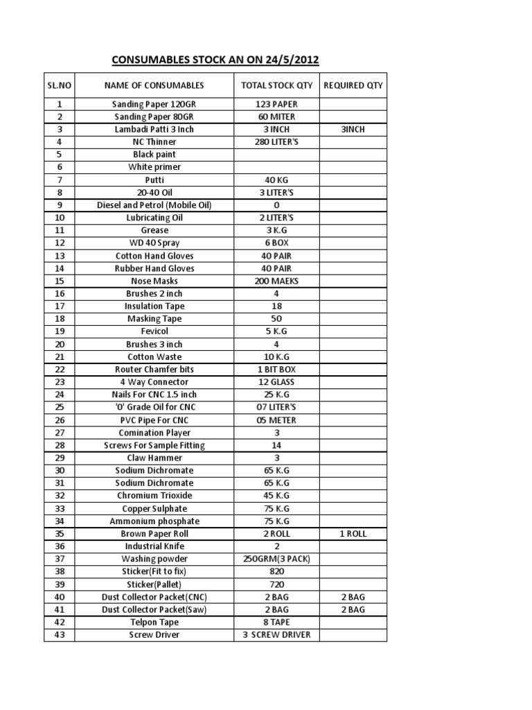 SL.NO 1 2 3 4 5 6 7 8 9 10 11 12 13 14 15 16 17 18 19 20 21 22 23 24 25 26 27 28 29 30 31 32 33 34 35 36 37 38 39 40 41 42 43 NAME OF CONSUMABLES Sanding Paper 120GR Sanding Paper 80GR Lambadi Patti 3 Inch NC Thinner Black paint White primer Putti 20-40 Oil Diesel and Petrol (Mobile Oil) Lubricating Oil Grease WD 40 Spray Cotton Hand Gloves Rubber Hand Gloves Nose Masks Brushes 2 inch Insulation Tape Masking Tape Fevicol Brushes 3 inch Cotton Waste Router Chamfer bits 4 Way Connector Nails For CNC 1.5 inch '0' Grade Oil for CNC PVC Pipe For CNC Comination Player Screws For Sample Fitting Claw Hammer Sodium Dichromate Sodium Dichromate Chromium Trioxide Copper Sulphate Ammonium phosphate Brown Paper Roll Industrial Knife Washing powder Sticker(Fit to fix) Sticker(Pallet) Dust Collector Packet(CNC) Dust Collector Packet(Saw) Telpon Tape Screw Driver TOTAL STOCK QTY 123 PAPER 60 MITER 3 INCH 280 LITER'S REQUIRED QTY