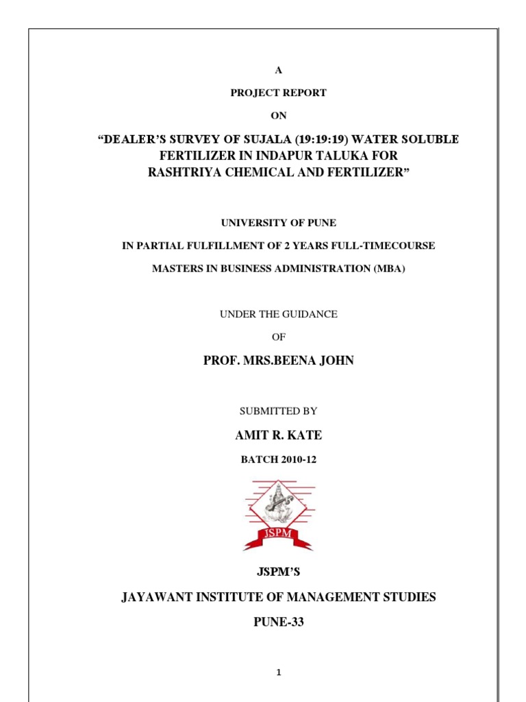 Now a day farming system change very rapidly, farmer use new technology and innovative idea to improve yield. Farmer not doing traditional farming to meat the food demand of his family only. They see the farming in business view to increase yield for increase profit. Indian population also change very rapidly, hence there is need to meat food demand for increasing population. There for it necessary to improve yield /ha. For increasing yield its need to use new technology and fertilizer in agriculture Water Soluble Fertilizer is help farmer to improve yield. Use of water soluble fertilizer is benefited to farmer because it require less labour and in less quantity of fertilizer by apply them through drip irrigation and foliar spray. this fertilizer have long duration effect on crop due to they directly available root zone of crop. water soluble fertilizer also have cost saving they require less quantity as compare to other fertilizer. The Study based on Dealer survey of sujala water soluble fertilizer. Sujala (19:19:19) is a product of R.C.F company. R.C.F company start its first production unit in 1906 with producing single super phosphate. It is Indian government company which produce other fertilizer are Ujjwala ,Biola and microla. In this study we gain information on competitor of Sujala. To find awareness stage of Sujala water soluble fertilizer in market and to know the feedback about the product quality, price and packaging. for Sujala water soluble fertilizer there is four