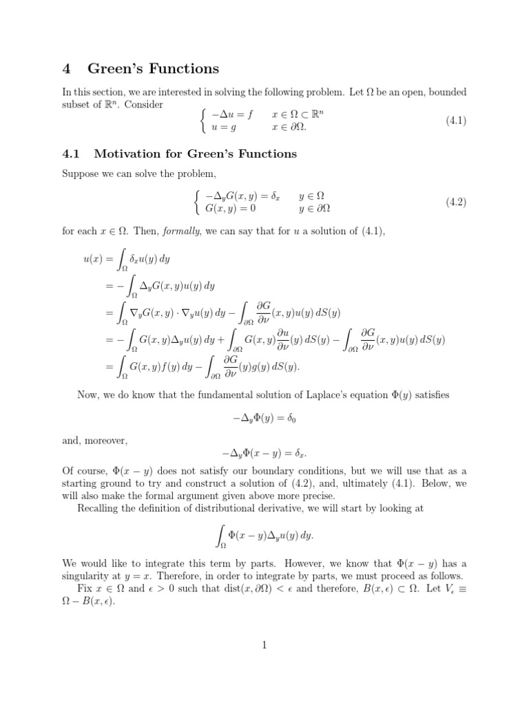 where is the fundamental solution of Laplaces equation and for each x , hx is a solution of (4.5). We leave it as an exercise to verify that G(x, y) satises (4.2) in the sense of distributions. Conclusion: If u is a (smooth) solution of (4.1) and G(x, y) is the Greens function for , then G u(x) = (x, y)g(y) dS(y) + G(x, y)f (y) dy. (4.7) 3