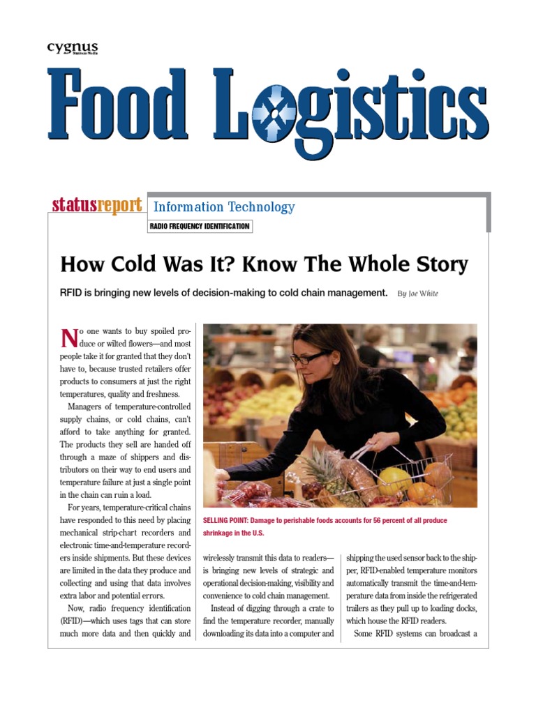 people take it for granted that they dont have to, because trusted retailers offer products to consumers at just the right temperatures, quality and freshness. Managers of temperature-controlled supply chains, or cold chains, cant afford to take anything for granted. The products they sell are handed off through a maze of shippers and distributors on their way to end users and temperature failure at just a single point in the chain can ruin a load. For years, temperature-critical chains have responded to this need by placing mechanical strip-chart recorders and electronic time-and-temperature recorders inside shipments. But these devices are limited in the data they produce and collecting and using that data involves extra labor and potential errors. Now, radio frequency identification (RFID)which uses tags that can store much more data and then quickly and wirelessly transmit this data to readers is bringing new levels of strategic and operational decision-making, visibility and convenience to cold chain management. Instead of digging through a crate to find the temperature recorder, manually downloading its data into a computer and shipping the used sensor back to the shipper, RFID-enabled temperature monitors automatically transmit the time-and-temperature data from inside the refrigerated trailers as they pull up to loading docks, which house the RFID readers. Some RFID systems can broadcast a