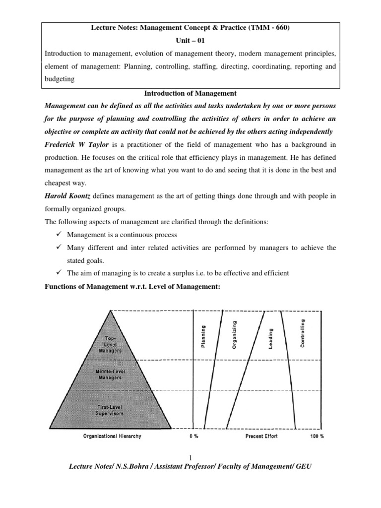 n management principles, element of management: Planning, controlling, staffing, directing, coordinating, reporting and budgeting Introduction of Management Management can be defined as all the activities and tasks undertaken by one or more persons for the purpose of planning and controlling the activities of others in order to achieve an objective or complete an activity that could not be achieved by the others acting independently Frederick W Taylor is a practitioner of the field of management who has a background in production. He focuses on the critical role that efficiency plays in management. He has defined management as the art of knowing what you want to do and seeing that it is done in the best and cheapest way. Harold Koontz defines management as the art of getting things done through and with people in formally organized groups. The following aspects of management are clarified through the definitions: Management is a continuous process Many different and inter related activities are performed by managers to achieve the stated goals. The aim of managing is to create a surplus i.e. to be effective and efficient Functions of Management w.r.t. Level of Management: