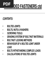 where Pi = bolt preload (called Fi in Shigley). T = bolt installation torque. K = torque coefficient. D = bolt nominal shank diameter (i.e., bolt nominal size). Torque coefficient K is a function of thread geometry, thread coefficient of friction t, and collar coefficient of friction c. Look up K for your specific thread interface and collar (bolt head or nut annulus) interface materials, surface condition, and lubricant (if any). ("Torque specs for screws," Shigley, and various other sources discuss various K value estimates.) If you cannot find or obtain K from credible references or sources for your specific interfaces, then you would need to research to try to find the coefficients of friction for your specific interfaces, then calculate K yourself using one of the following two formulas listed below (Shigley, Mechanical Engineering Design, 5 ed., McGraw-Hill, 1989, p. 346, Eq. 8-19, and MIL-HDBK-60, 1990, Sect. 100.5.1, p. 26, Eq. 100.5.1, respectively), the latter being far simpler. K = {[(0.5 dp)(tan + t sec )/(1 t tan sec )] + [0.625 c D]}/D K = {[0.5 p/] + [0.5 t (D 0.75 p sin )/sin ] + [0.625 c D]}/D where D = bolt nominal shank diameter. p = thread pitch (bolt longitudinal distance per thread). = thread profile angle = 60 (for M, MJ, UN, UNR, and UNJ thread profiles). = thread profile half angle = 60/2 = 30. tan = thread helix angle tan = p/( dp). dp = bolt pitch diameter. t = thread coefficient of friction. c = collar coefficient of friction. D and p can be obtained from bolt tables such as Standard Metric and USA Bolt Shank Dimensions. (Eq. 2) (Eq. 3)