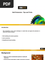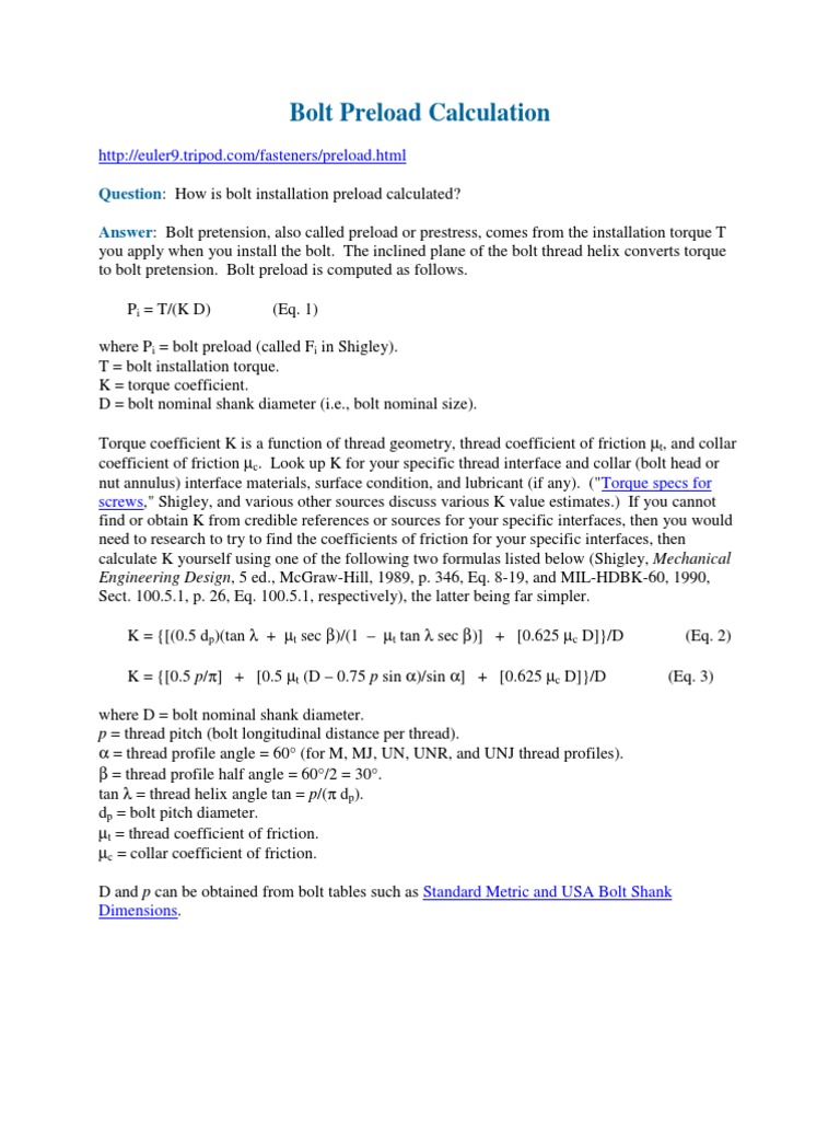 http://euler9.tripod.com/fasteners/preload.html Question: How is bolt installation preload calculated? Answer: Bolt pretension, also called preload or prestress, comes from the installation torque T you apply when you install the bolt. The inclined plane of the bolt thread helix converts torque to bolt pretension. Bolt preload is computed as follows. Pi = T/(K D) (Eq. 1)