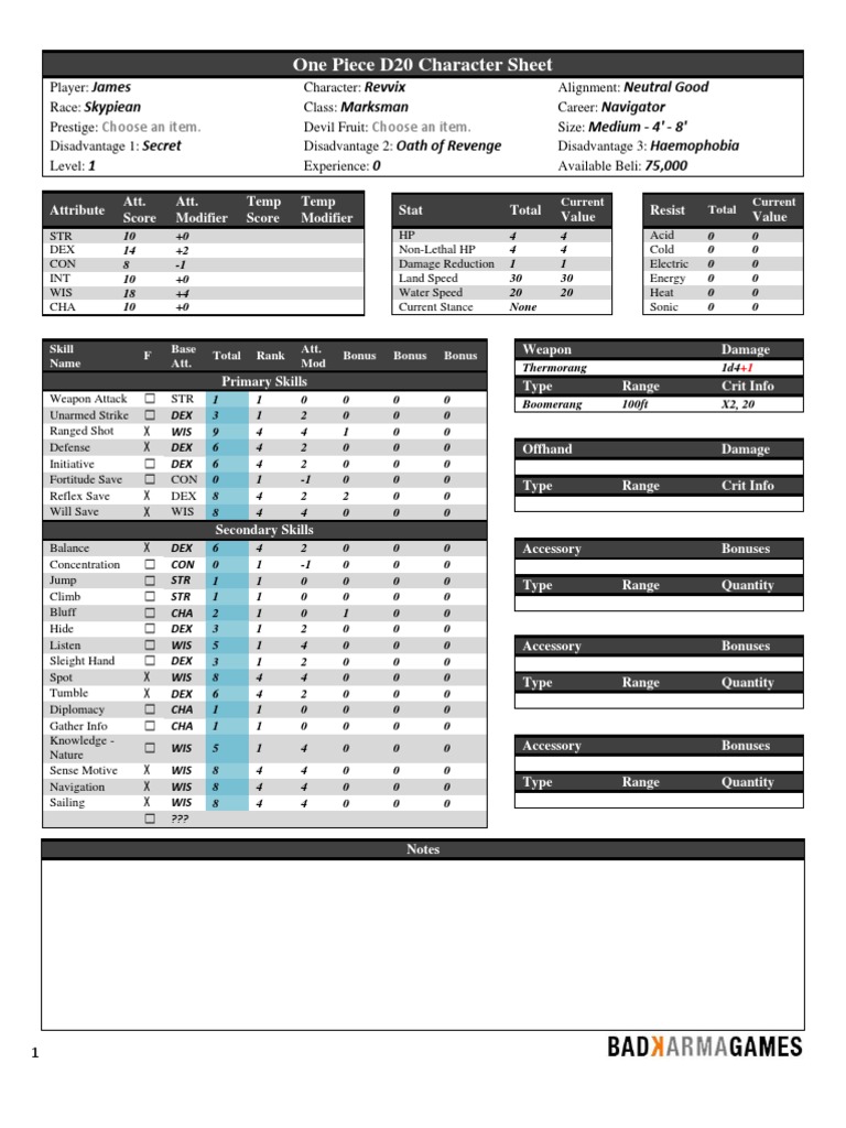 One Piece D20 Character Sheet
