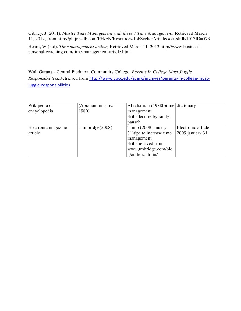 Abraham.m (19880)time dictionary management skills.lecture by randy pausch Tim,b (2008 january Electronic article 31)tips to increase time 2009,january 31 management skills.retrived from www,tmbridge.com/blo g/author/admin/
