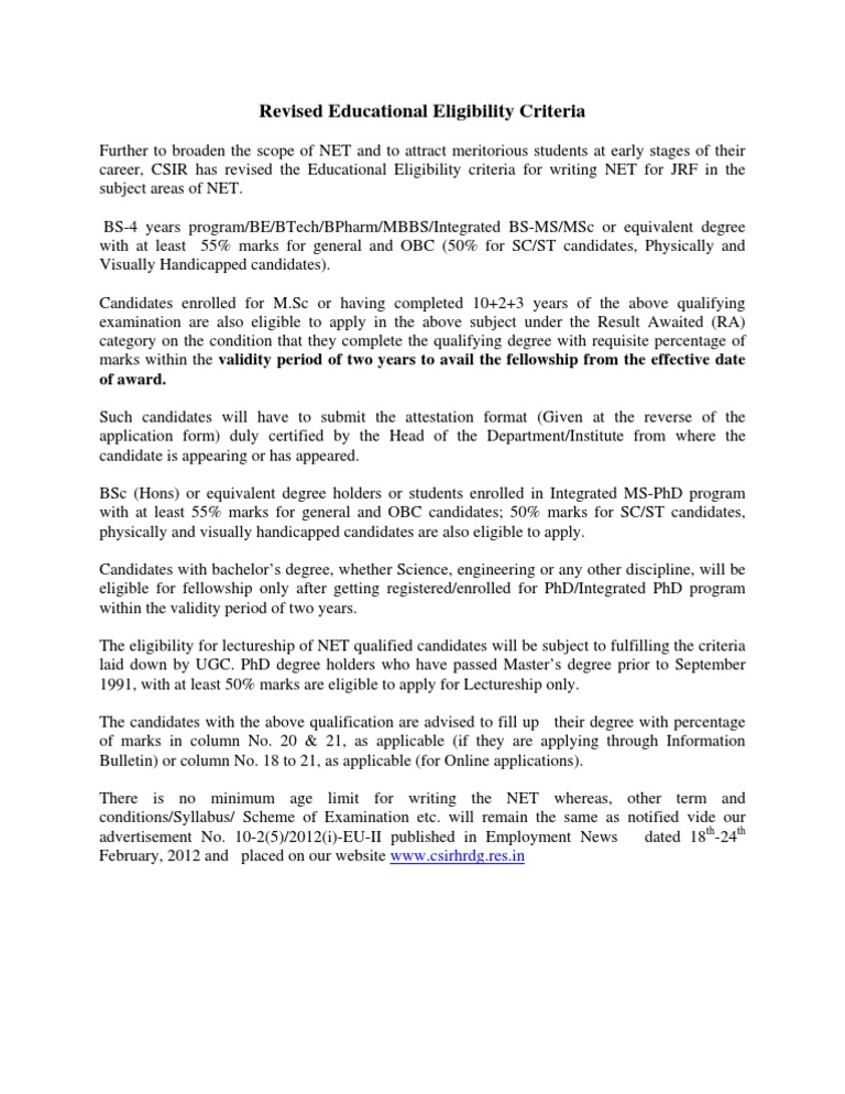 Further to broaden the scope of NET and to attract meritorious students at early stages of their career, CSIR has revised the Educational Eligibility criteria for writing NET for JRF in the subject areas of NET. BS-4 years program/BE/BTech/BPharm/MBBS/Integrated BS-MS/MSc or equivalent degree with at least 55% marks for general and OBC (50% for SC/ST candidates, Physically and Visually Handicapped candidates). Candidates enrolled for M.Sc or having completed 10+2+3 years of the above qualifying examination are also eligible to apply in the above subject under the Result Awaited (RA) category on the condition that they complete the qualifying degree with requisite percentage of marks within the validity period of two years to avail the fellowship from the effective date of award. Such candidates will have to submit the attestation format (Given at the reverse of the application form) duly certified by the Head of the Department/Institute from where the candidate is appearing or has appeared. BSc (Hons) or equivalent degree holders or students enrolled in Integrated MS-PhD program with at least 55% marks for general and OBC candidates; 50% marks for SC/ST candidates, physically and visually handicapped candidates are also eligible to apply. Candidates with bachelors degree, whether Science, engineering or any other discipline, will be eligible for fellowship only after getting registered/enrolled for PhD/Integrated PhD program within the validity period of two years. The eligibility for lectureship of NET qualified candidates will be subject to fulfilling the criteria laid down by UGC. PhD degree holders who have passed Masters degree prior to September 1991, with at least 50% marks are eligible to apply for Lectureship only. The candidates with the above qualification are advised to fill up their degree with percentage of marks in column No. 20 & 21, as applicable (if they are applying through Information Bulletin) or column No. 18 to 21, as applicable (for Online applications). There is no minimum age limit for writing the NET whereas, other term and conditions/Syllabus/ Scheme of Examination etc. will remain the same as notified vide our advertisement No. 10-2(5)/2012(i)-EU-II published in Employment News dated 18th-24th February, 2012 and placed on our website www.csirhrdg.res.in