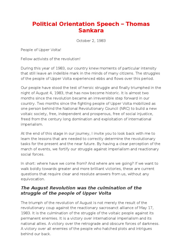 October 2, 1983People of Upper Volta!Fellow activists of the revolution!During this year of 1983, our country knew moments of particular intensitythat still leave an indelible mark in the minds of many citizens. The strugglesof the people of Upper Volta experienced ebbs and flows over this period.Our people have stood the test of heroic struggle and finally triumphed in thenight of August 4, 1983, that has now become historic. It is almost twomonths since the revolution became an irreversible step forward in ourcountry. Two months since the fighting people of Upper Volta mobilized asone person behind the National Revolutionary Council (NRC) to build a newvoltaic society, free, independent and prosperous, free of social injustice,freed from the century long domination and exploitation of internationalimperialism.At the end of this stage in our journey, I invite you to look back with me tolearn the lessons that are needed to correctly determine the revolutionarytasks for the present and the near future. By having a clear perception of themarch of events, we fortify our struggle against imperialism and reactionarysocial forces.In short: where have we come from? And where are we going? If we want towalk boldly towards greater and more brilliant victories, these are currentquestions that require clear and resolute answers from us, without anyequivocation.