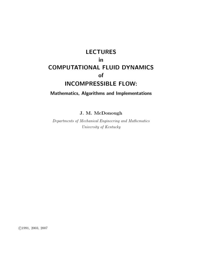 Computational uid dynamics (CFD) can be traced to the early attempts to numerically solve the Euler equations in order to predict eects of bomb blast waves following WW II at the beginning of the Cold War. In fact, such eorts were prime drivers in the development of digital computers, and what would ultimately come to be termed supercomputers. Such work was motivated further by the Space Race with the (former) Soviet Union, beginning in the late 1950s. The terminology computational uid dynamics, however, was seldom, if ever, used during this early period; moreover, computational facilities were so inadequate that it was not until the late 1960s that anything even remotely resembling a modern CFD problem could be attempted. The rst book devoted to CFD was written by Patrick Roache during a year-long visit to the Mechanical Engineering Department of the University of Kentucky during 197071, and was published the following year [1]. Computing power at that time was still grossly inadequate for what we today would consider useful calculations, but signicant eorts in algorithm development and analysis were underway in many leading research universities and national laboratories within the U.S., in Europe (especially France, Great Britain and Sweden) and in the (former) Soviet Union. Today, at the beginning of the 21st Century, CFD can be viewed as a mature discipline, at least in the sense that it has been universally recognized as essential for engineering analyses associated with transport phenomena, and with regard to the fact that numerous commercial computer codes are now available. Such codes can be executed even on PCs for fairly complex uid ow problems. Despite this, CFD is not always a part of university curricula and, indeed, it is almost never a required component for a degreeprimarily because faculty whose backgrounds do not include CFD have yet to retire, and consequently badly-needed curriculum renovations have not been possible. We have oered elective courses on CFD at both graduate and undergraduate levels for the past 12 years at the University of Kentucky, but like most universities we do not have a formal CFD Program in place. Such a program should consist of at least one required undergraduate course in which students would learn to employ a well-known commercial CFD package in solving real-world engineering problems involving uid ow and heat and mass transfer (just has been required in nite-element analysis of structures for many years). Then at least one (but preferably two) graduate classes in computational numerical analysis should be availablepossibly through an applied mathematics program. The CFD graduate curriculum, per se, should consist of at least the following four one-semester courses: i) CFD of incompressible ow, ii) CFD of compressible ow, iii) turbulence modeling and simulation and iv) grid generation. Clearly, a fth course on computational transport processes and combustion would be very desirable. The two computational numerical analysis courses and the rst two CFD classes have been taught at the University of Kentucky since 1990 with an introduction to grid generation provided in the second of the numerical analysis classes, an advanced graduate numerical partial dierential equations (PDEs) course. The present lecture notes correspond to the rst item of the above list. They are written to emphasize the mathematics of the NavierStokes (N.S.) equations of incompressible ow and the algorithms that have been developed over the past 30 years for solving them. This author is thoroughly convinced that some background in the mathematics of the N.S. equations is essential to avoid conducting exhaustive studies (and expending considerable eort in doing so) when the mathematics of the problem shows that the direction being pursued cannot possibly succeed. (We will provide specic examples of this in Chap. 2 of these lectures.) Thus, Chap. 1 is devoted to a fairly advanced presentation of the known theory of the N.S. equations. The main theorems regarding existence, uniqueness and regularity of solutions will be presented, and put into a computational context, but without proofs. Omission of these (which tend to be extremely technical, mathematically) is for the sake of engineering students, and we will provide essential references from which mathematicians can obtain proofs and other details of the mathematics.