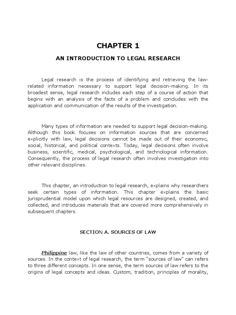 Philippine law, like the law of other countries, comes from a variety of sources. In the context of legal research, the term sources of law can refers to three different concepts. In one sense, the term sources of law refers to the origins of legal concepts and ideas. Custom, tradition, principles of morality,