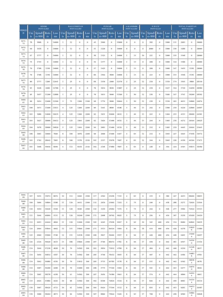 The document provides data on the growth of the textile industry in Pakistan by province from 1971-72 to 2010-11. It shows the number of textile units installed, spindles in thousands, rotors, and looms each year by province. The textile industry grew significantly over this period across all provinces, with the largest growth in Punjab province. By 2010-11 there were over 160,000 textile units installed across Pakistan.