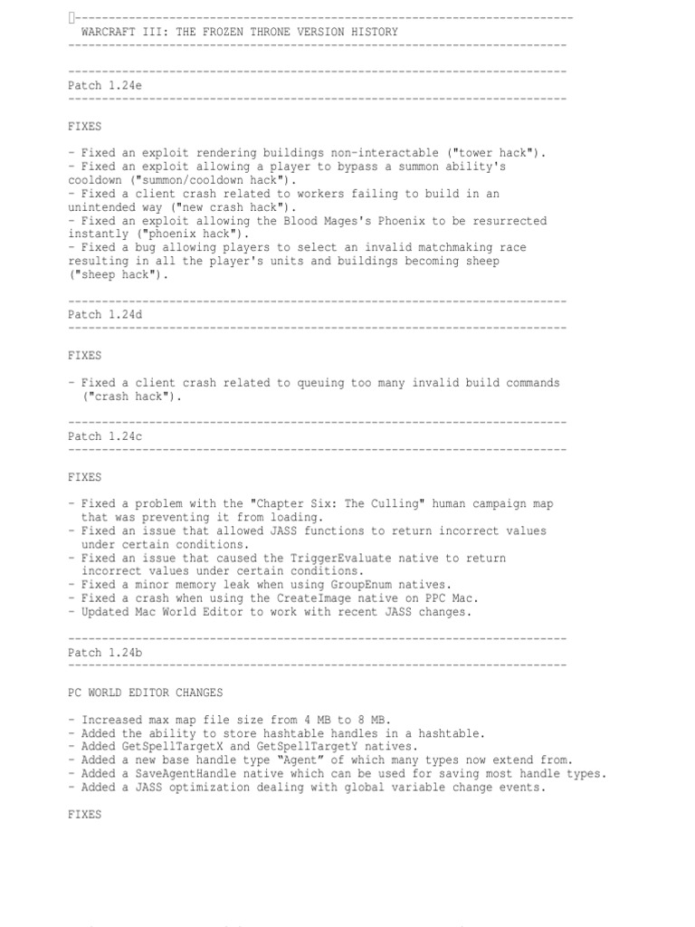 24e -------------------------------------------------------------------------FIXES - Fixed an exploit rendering buildings non-interactable ("tower hack"). - Fixed an exploit allowing a player to bypass a summon ability's cooldown ("summon/cooldown hack"). - Fixed a client crash related to workers failing to build in an unintended way ("new crash hack"). - Fixed an exploit allowing the Blood Mages's Phoenix to be resurrected instantly ("phoenix hack"). - Fixed a bug allowing players to select an invalid matchmaking race resulting in all the player's units and buildings becoming sheep ("sheep hack"). -------------------------------------------------------------------------Patch 1.24d -------------------------------------------------------------------------FIXES - Fixed a client crash related to queuing too many invalid build commands ("crash hack"). -------------------------------------------------------------------------Patch 1.24c -------------------------------------------------------------------------FIXES - Fixed a problem with the "Chapter Six: The Culling" human campaign map that was preventing it from loading. - Fixed an issue that allowed JASS functions to return incorrect values under certain conditions. - Fixed an issue that caused the TriggerEvaluate native to return incorrect values under certain conditions. - Fixed a minor memory leak when using GroupEnum natives. - Fixed a crash when using the CreateImage native on PPC Mac. - Updated Mac World Editor to work with recent JASS changes. -------------------------------------------------------------------------Patch 1.24b -------------------------------------------------------------------------PC WORLD EDITOR CHANGES Increased max map file size from 4 MB to 8 MB. Added the ability to store hashtable handles in a hashtable. Added GetSpellTargetX and GetSpellTargetY natives. Added a new base handle type Agent of which many types now extend from. Added a SaveAgentHandle native which can be used for saving most handle types. Added a JASS optimization dealing with global variable change events.