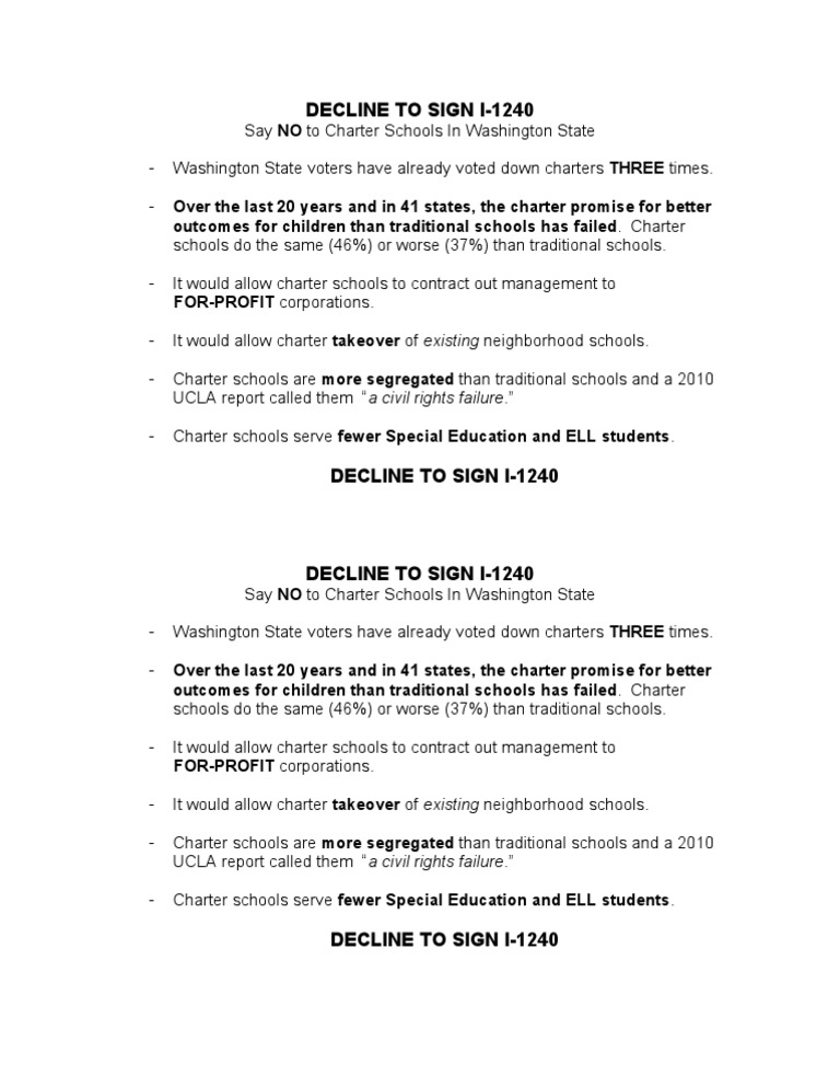 Say NO to Charter Schools In Washington State Washington State voters have already voted down charters THREE times. Over the last 20 years and in 41 states, the charter promise for better outcomes for children than traditional schools has failed. Charter schools do the same (46%) or worse (37%) than traditional schools. It would allow charter schools to contract out management to FOR-PROFIT corporations. It would allow charter takeover of existing neighborhood schools. Charter schools are more segregated than traditional schools and a 2010 UCLA report called them a civil rights failure. Charter schools serve fewer Special Education and ELL students.