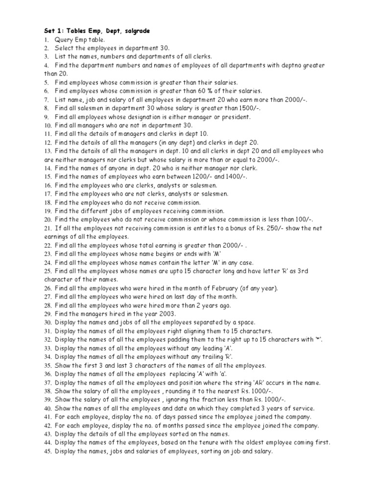 List the names, numbers and departments of all clerks. 4. Find the department numbers and names of employees of all departments with deptno greater than 20. 5. Find employees whose commission is greater than their salaries. 6. Find employees whose commission is greater than 60 % of their salaries. 7. List name, job and salary of all employees in department 20 who earn more than 2000/-. 8. Find all salesmen in department 30 whose salary is greater than 1500/-. 9. Find all employees whose designation is either manager or president. 10. Find all managers who are not in department 30. 11. Find all the details of managers and clerks in dept 10. 12. Find the details of all the managers (in any dept) and clerks in dept 20. 13. Find the details of all the managers in dept. 10 and all clerks in dept 20 and all employees who are neither managers nor clerks but whose salary is more than or equal to 2000/-. 14. Find the names of anyone in dept. 20 who is neither manager nor clerk. 15. Find the names of employees who earn between 1200/- and 1400/-. 16. Find the employees who are clerks, analysts or salesmen. 17. Find the employees who are not clerks, analysts or salesmen. 18. Find the employees who do not receive commission. 19. Find the different jobs of employees receiving commission. 20. Find the employees who do not receive commission or whose commission is less than 100/-. 21. If all the employees not receiving commission is entitles to a bonus of Rs. 250/- show the net earnings of all the employees. 22. Find all the employees whose total earning is greater than 2000/- . 23. Find all the employees whose name begins or ends with M 24. Find all the employees whose names contain the letter M in any case. 25. Find all the employees whose names are upto 15 character long and have letter R as 3rd character of their names. 26. Find all the employees who were hired in the month of February (of any year). 27. Find all the employees who were hired on last day of the month. 28. Find all the employees who were hired more than 2 years ago. 29. Find the managers hired in the year 2003. 30. Display the names and jobs of all the employees separated by a space. 31. Display the names of all the employees right aligning them to 15 characters. 32. Display the names of all the employees padding them to the right up to 15 characters with *. 33. Display the names of all the employees without any leading A. 34. Display the names of all the employees without any trailing R. 35. Show the first 3 and last 3 characters of the names of all the employees. 36. Display the names of all the employees replacing A with a. 37. Display the names of all the employees and position where the string AR occurs in the name. 38. Show the salary of all the employees , rounding it to the nearest Rs. 1000/-. 39. Show the salary of all the employees , ignoring the fraction less than Rs. 1000/-. 40. Show the names of all the employees and date on which they completed 3 years of service. 41. For each employee, display the no. of days passed since the employee joined the company. 42. For each employee, display the no. of months passed since the employee joined the company. 43. Display the details of all the employees sorted on the names. 44. Display the names of the employees, based on the tenure with the oldest employee coming first. 45. Display the names, jobs and salaries of employees, sorting on job and salary.