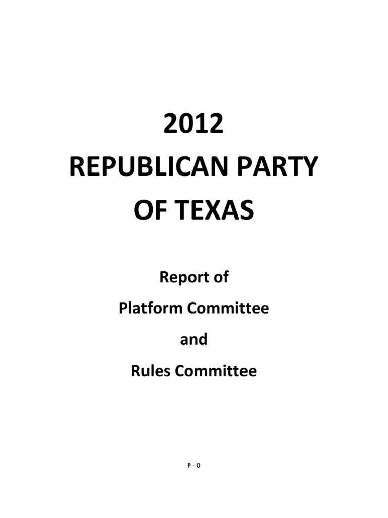 hall meetings in which the voters can express their wishes and thoughts about the leadership for the 83rd Session. Texas House Leadership Caucus We call for the Republican members of the Texas House of Representatives to convene in caucus after each November general election to determine by secret ballot their candidate for Speaker of the House, and that rules be instituted to ensure the integrity and security of the secret ballot so that members may vote without risk of retribution by the prevailing party. We also call for the Republican members of the Texas House to vote as a unified body for their selected speaker candidate when the Legislature convenes in regular session and a vote for speaker is called on the House Floor. Residency Requirements - We support legislation that determines residence in accordance with commonlaw rules, as recognized by the courts, except as otherwise provided by the Texas Election Code. Campaign Finance Reform - We urge immediate repeal of the McCain-Feingold Act. Enforcing the Platform - Every Republican is responsible for implementing this platform. Party candidates should indicate their positions on platform planks before their acceptance on the ticket and such information should be available on the Party website. Contributions to Conservative Candidates - We strongly oppose the Republican Party of Texas, Republican National Committee, the National Republican Senatorial Campaign Committee, Republican candidates and elected officials, political action committees, and politically active non-profit organizations from being financially supported by any individual or organization that have personal or financial ties, directly or indirectly, to organizations who do not support the principles of the Republican Party of Texas Platform. Conflicts of Interest - We support legislation prohibiting influencing or voting of any elected official or appointee where a conflict of interest exists. No such official should represent paying clients before a state agency. Lobbying Limitation - We support legislation to prohibit former officials and government employees from lobbying for a foreign government and/or any business for five years after leaving public service. We support legislation to prevent lobbying by any organization receiving federal grants except that relating to its tax status. AWOL Legislators - We urge the Texas House and Senate to compel attendance of absent members and penalize those who attempt to break the quorum by not being in attendance. Governors Veto - We urge a Constitutional amendment permitting the Legislature to return for a three-day session in response to the governors veto. House Speaker Pledge Cards We call on the Texas Legislature to cease the use of pledge cards in all future House Speaker races. Term Limits- We urge Congress, the Legislature, and the Republican Party to institute Term Limits. Filibuster We support return to the traditional Filibuster in the U.S. Senate. Rosebush-Blocker Rule We strongly oppose the re-adoption of the Rosebush-Blocker rule in the Texas Senate. Consolidated Elections - All public elections, should be consolidated to Primary and General election days and locations. Rights Versus Products -- We oppose calling welfare and other income and product redistribution schemes rights or entitlements. We know that fundamental human rights are inherent to individuals and are granted by God and are protected by the Declaration of Independence and U.S. Constitution. They are not products of others labor. Unalienable rights, such as life, liberty, pursuit of happiness, property rights, free speech, religious freedom, self-defense, etc. do not impose on others rights whereas income and product redistribution invariably do so. HONORING THE SYMBOLS OF OUR AMERICAN HERITAGE P6