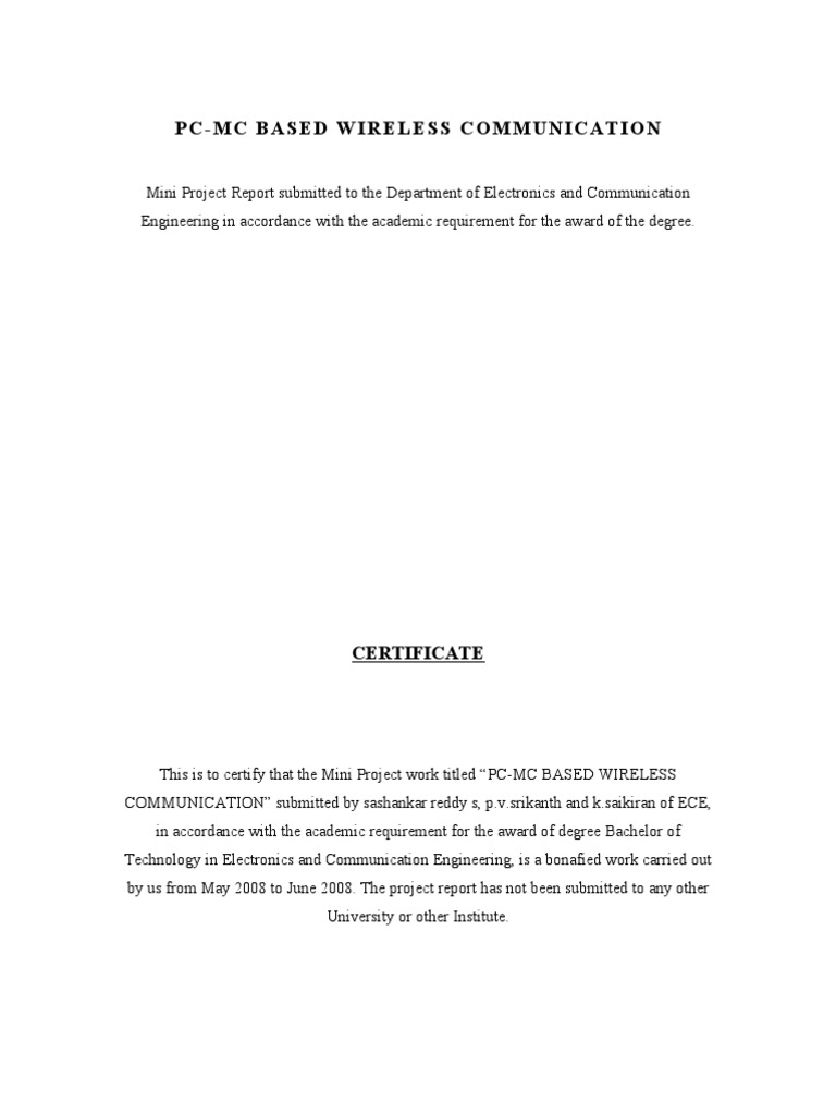This is to certify that the Mini Project work titled PC-MC BASED WIRELESS COMMUNICATION submitted by sashankar reddy s, p.v.srikanth and k.saikiran of ECE, in accordance with the academic requirement for the award of degree Bachelor of Technology in Electronics and Communication Engineering, is a bonafied work carried out by us from May 2008 to June 2008. The project report has not been submitted to any other University or other Institute.