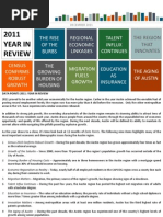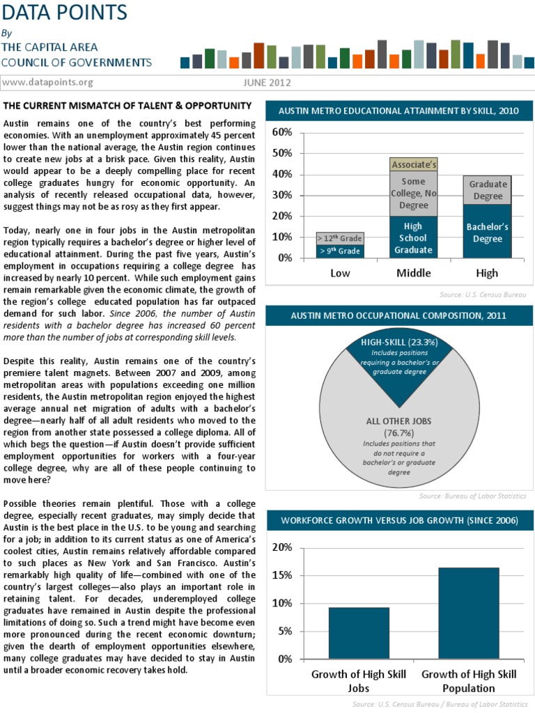 Today, nearly one in four jobs in the Austin metropolitan region typically requires a bachelors degree or higher level of educational attainment. During the past five years, Austins employment in occupations requiring a college degree has increased by nearly 10 percent. While such employment gains remain remarkable given the economic climate, the growth of the regions college educated population has far outpaced demand for such labor. Since 2006, the number of Austin residents with a bachelor degree has increased 60 percent more than the number of jobs at corresponding skill levels. Despite this reality, Austin remains one of the countrys premiere talent magnets. Between 2007 and 2009, among metropolitan areas with populations exceeding one million residents, the Austin metropolitan region enjoyed the highest average annual net migration of adults with a bachelors degreenearly half of all adult residents who moved to the region from another state possessed a college diploma. All of which begs the questionif Austin doesnt provide sufficient employment opportunities for workers with a four-year college degree, why are all of these people continuing to move here? Possible theories remain plentiful. Those with a college degree, especially recent graduates, may simply decide that Austin is the best place in the U.S. to be young and searching for a job; in addition to its current status as one of Americas coolest cities, Austin remains relatively affordable compared to such places as New York and San Francisco. Austins remarkably high quality of lifecombined with one of the countrys largest collegesalso plays an important role in retaining talent. For decades, underemployed college graduates have remained in Austin despite the professional limitations of doing so. Such a trend might have become even more pronounced during the recent economic downturn; given the dearth of employment opportunities elsewhere, many college graduates may have decided to stay in Austin until a broader economic recovery takes hold.
