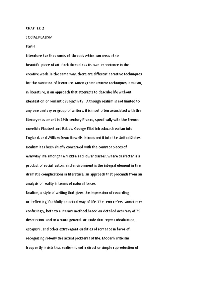 history can afford to neglect the social tensions and the economic pressures of the age in the formation of character; Mulk Raj Anand stepped out into a regenerative humanism which he is still pursuing with vitality and assurance. Part-IV Literature emerges out of life and records our dreams and ideas, hopes and aspirations, failures and disappointments, motives and passions, and experiences and observations. Over the years, literature has reflected the prevailing social issues in many eminent works of literature under the shadow of realism. In Realism, social reality is one aspect of the picture but it cannot be isolated as though it were an entity by itself. It cannot be taken out of the context of the general cultural pattern of a period. Even there have been honest attempts to recreate 117 incidents from great literatures of the past ages. It is again due to a certain vulgarization on a different level. With all their immense resources of visual presentation, the makers of our soul of art. Yet that reality has been conveyed for hundreds of years by the art players of Bengals countryside who work without a stage or scenic effects, almost without any kind of equipment, relying entirely on the simplest dramatic devices. They convey truth, the truth of emotion, which is the ultimate of realism. This aspect of realism is lacking in the works of some of the writers. Realism as it should be truthful and honest picture of society. It should be true attempt to focus on reality with the concern to make it superior world. It is also very important to note here at this junction that the fast