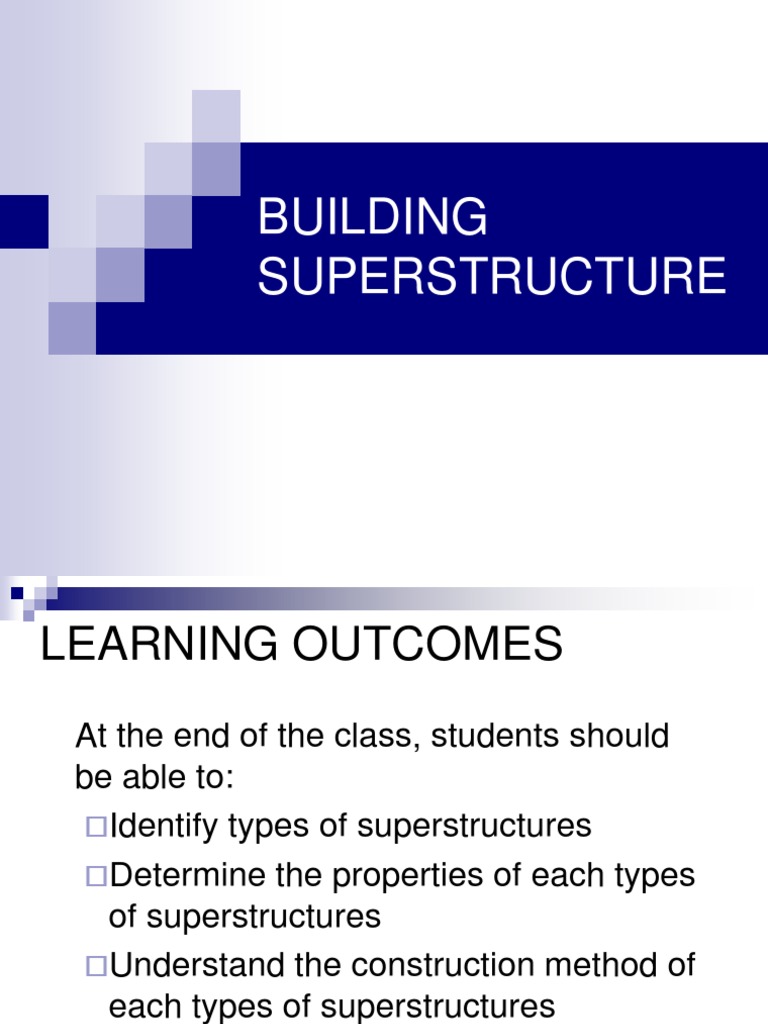 At the end of the class, students should be able to: Identify types of superstructures Determine the properties of each types of superstructures Understand the construction method of each types of superstructures