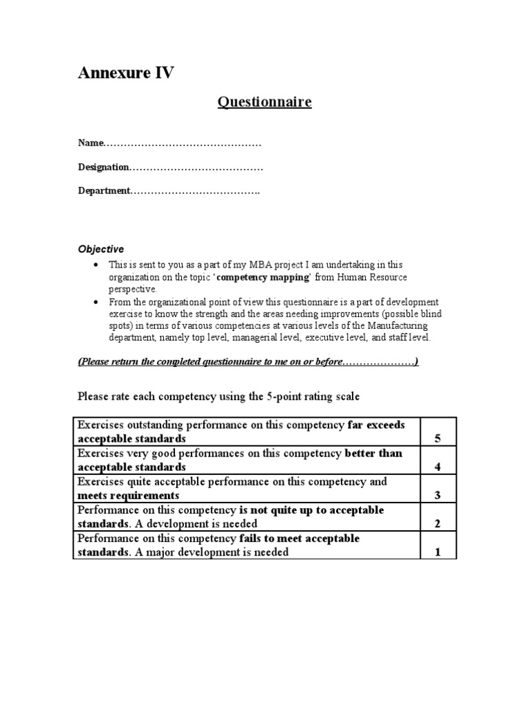 Objective This is sent to you as a part of my MBA project I am undertaking in this organization on the topic competency mapping from Human Resource perspective. From the organizational point of view this questionnaire is a part of development exercise to know the strength and the areas needing improvements (possible blind spots) in terms of various competencies at various levels of the Manufacturing department, namely top level, managerial level, executive level, and staff level. (Please return the completed questionnaire to me on or before)