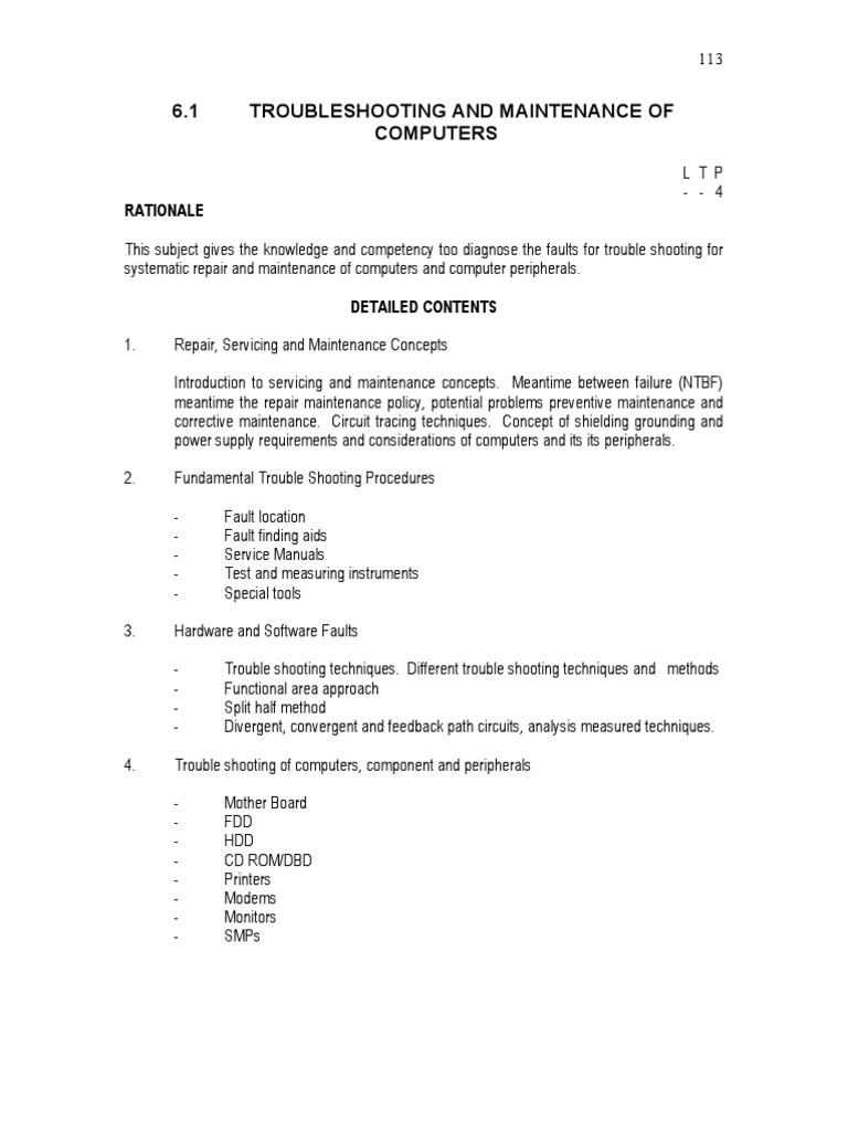 This subject gives the knowledge and competency too diagnose the faults for trouble shooting for systematic repair and maintenance of computers and computer peripherals. DETAILED CONTENTS 1. Repair, Servicing and Maintenance Concepts Introduction to servicing and maintenance concepts. Meantime between failure (NTBF) meantime the repair maintenance policy, potential problems preventive maintenance and corrective maintenance. Circuit tracing techniques. Concept of shielding grounding and power supply requirements and considerations of computers and its its peripherals. 2. Fundamental Trouble Shooting Procedures 3. Fault location Fault finding aids Service Manuals Test and measuring instruments Special tools