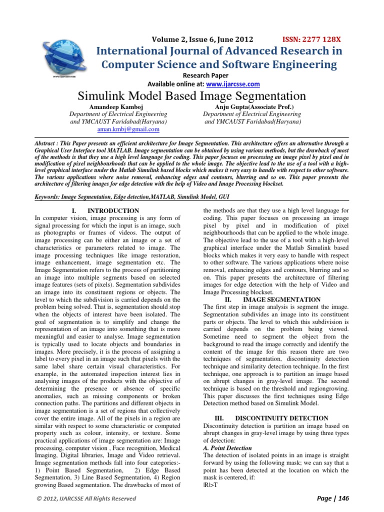 Abstract : This Paper presents an efficient architecture for Image Segmentation. This architecture offers an alternative through a Graphical User Interface tool MATLAB. Image segmentation can be obtained by using various methods, but the drawback of most of the methods is that they use a high level language for coding. This paper focuses on processing an image pixel by pixel and in modification of pixel neighbourhoods that can be applied to the whole image. The objective lead to the use of a tool with a highlevel graphical interface under the Matlab Simulink based blocks which makes it very easy to handle with respect to other software. The various applications where noise removal, enhancing edges and contours, blurring and so on. This paper presents the architecture of filtering images for edge detection with the help of Video and Image Processing blockset. Keywords: Image Segmentation, Edge detection,MATLAB, Simulink Model, GUI