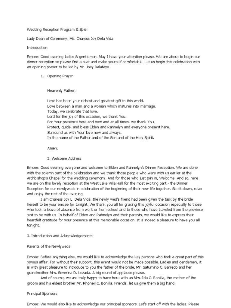 Heavenly Father, Love has been your richest and greatest gift to this world. Love between a man and a woman which matures into marriage. Today, we celebrate that love. Lord for the joy of this occasion, we thank You. For Your presence here and now and at all times, we thank You. Protect, guide, and bless Elden and Rahnelyn and everyone present here. Surround us with Your love now and always. In the name of the Father and of the Son and of the Holy Spirit. Amen. 2. Welcome Address Emcee: Good evening everyone and welcome to Elden and Rahnelyns Dinner Reception. We are done with the solemn part of the celebration and we thank those people who were with us earlier at the Archbishops Chapel for the wedding ceremony. And for those who just join in, Welcome! And so, here we are on this lovely reception at the West Lake Villa Hall for the most exciting part - the Dinner Reception for our newlyweds in celebration of the beginning of their new life together. So sit down, relax and enjoy the rest of the evening. I am Charess Joy L. Dela Vida, the newly weds friend had been given the task by the bride herself to be your emcee for tonight. We thank you all for gracing this joyful occasion especially to those who took a leave of absence from work or from school and to those who have traveled from the province just to be with us. In behalf of Elden and Rahnelyn and their parents, we would like to express their heartfelt gratitude for your presence at this memorable occasion. It is indeed a pleasure to have you all tonight. 3. Introduction and Acknowledgements Parents of the Newlyweds Emcee: Before anything else, we would like to acknowledge the key persons who took a great part of this joyous affair. For without their support, this event would not be made possible. Ladies and gentlemen, it is with great pleasure to introduce to you the father of the bride, Mr. Saturnino C. Barredo and her grandmother Mrs. Severina D. Lozada. A big round of applause please. And of course, we are truly happy to have here with us Mrs. Ida C. Bonilla, the mother of the groom and his eldest brother Mr. Rhoneil C. Bonilla. Friends, let us give them a big hand. Principal Sponsors Emcee: We would also like to acknowledge our principal sponsors. Lets start off with the ladies. Please stand as your name is called.