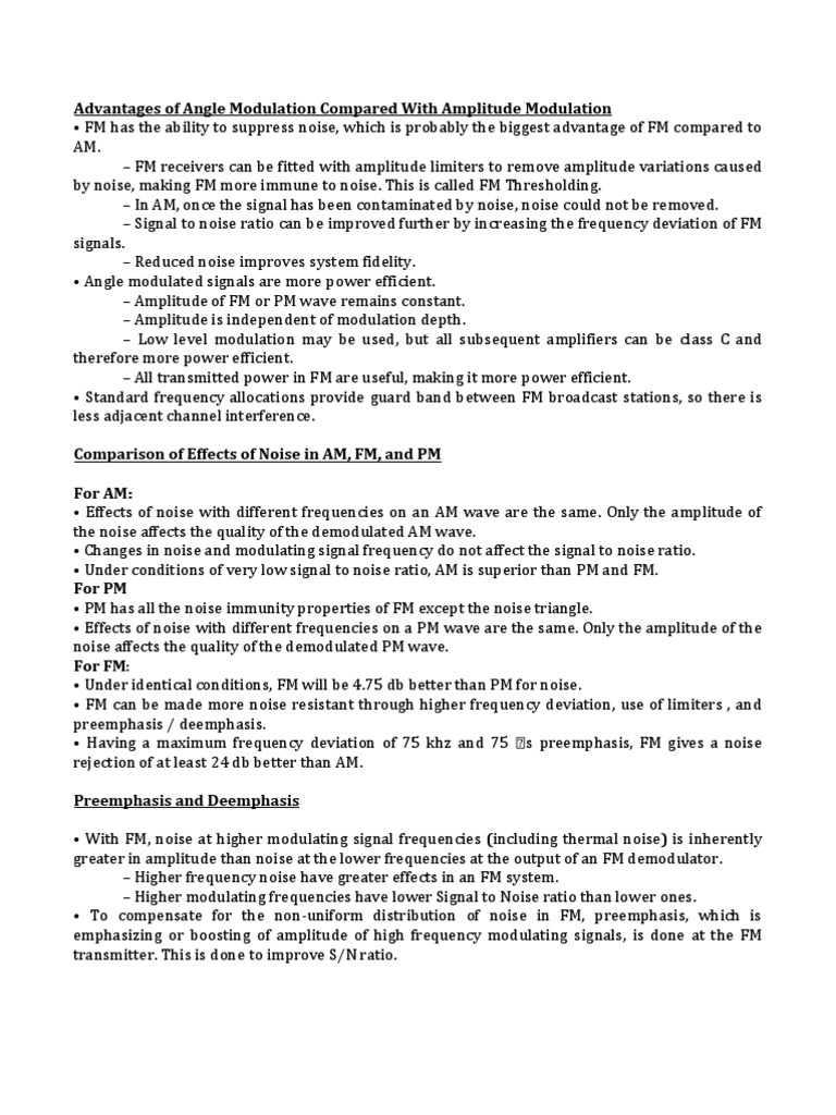 e biggest advantage of FM compared to AM. FM receivers can be fitted with amplitude limiters to remove amplitude variations caused by noise, making FM more immune to noise. This is called FM Thresholding. In AM, once the signal has been contaminated by noise, noise could not be removed. Signal to noise ratio can be improved further by increasing the frequency deviation of FM signals. Reduced noise improves system fidelity. Angle modulated signals are more power efficient. Amplitude of FM or PM wave remains constant. Amplitude is independent of modulation depth. Low level modulation may be used, but all subsequent amplifiers can be class C and therefore more power efficient. All transmitted power in FM are useful, making it more power efficient. Standard frequency allocations provide guard band between FM broadcast stations, so there is less adjacent channel interference. Comparison of Effects of Noise in AM, FM, and PM For AM: Effects of noise with different frequencies on an AM wave are the same. Only the amplitude of the noise affects the quality of the demodulated AM wave. Changes in noise and modulating signal frequency do not affect the signal to noise ratio. Under conditions of very low signal to noise ratio, AM is superior than PM and FM. For PM PM has all the noise immunity properties of FM except the noise triangle. Effects of noise with different frequencies on a PM wave are the same. Only the amplitude of the noise affects the quality of the demodulated PM wave. For FM: Under identical conditions, FM will be 4.75 db better than PM for noise. FM can be made more noise resistant through higher frequency deviation, use of limiters , and preemphasis / deemphasis. Having a maximum frequency deviation of 75 khz and 75 s preemphasis, FM gives a noise rejection of at least 24 db better than AM. Preemphasis and Deemphasis With FM, noise at higher modulating signal frequencies (including thermal noise) is inherently greater in amplitude than noise at the lower frequencies at the output of an FM demodulator. Higher frequency noise have greater effects in an FM system. Higher modulating frequencies have lower Signal to Noise ratio than lower ones. To compensate for the non-uniform distribution of noise in FM, preemphasis, which is emphasizing or boosting of amplitude of high frequency modulating signals, is done at the FM transmitter. This is done to improve S/N ratio.