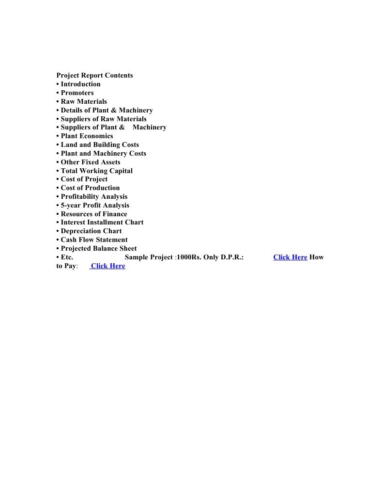 pliers of Plant & Machinery Plant Economics Land and Building Costs Plant and Machinery Costs Other Fixed Assets Total Working Capital Cost of Project Cost of Production Profitability Analysis 5-year Profit Analysis Resources of Finance Interest Installment Chart Depreciation Chart Cash Flow Statement Projected Balance Sheet Etc. Sample Project :1000Rs. Only D.P.R.: to Pay: Click Here
