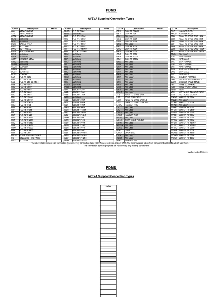 Description Notes CTYP Description Notes CTYP Description Notes CTYP Description ATTACHMENT FLGD FLG RF 300# GBX GSK RF PN400 ROD HANGER ROD ATTACHMENT FPIN Not Used GBY GSK RF 75# RROD HANGER ROD ATTACHMENT FRB FLG RTJ 150# GG Not Used SBB FLAN TO STUB END 150# Not Used FRD FLG RTJ 300# GGD GSK RF 300# SBD FLAN TO STUB END 300# Not Used FRE FLG RTJ 400# GRB GSK RF 150# SBE FLAN TO STUB END 400# CABLE TRAY FRF FLG RTJ 600# GRC Not Used SBF FLAN TO STUB END 600# BUTT WELD FRG FLG RTJ 900# GRD GSK RF 300# SBG FLAN TO STUB END 900# BUTT WELD FRH FLG RTJ 1500# GRE GSK RF 400# SBH FLAN TO STUB END 1500# WELD TO PIPE FRJ FLG RTJ 2500# GRF GSK RF 600# SBJ FLAN TO STUB END 2500# Not Used FRM Not Used GRG GSK RF 900# SBOL Not Used Not Used FRN Not Used GRH GSK RF 1500# SCF NPT FEMALE HANGER ATTA FRP Not Used GRJ GSK RF 2500# SCM NPT MALE Not Used FRQ Not Used GRM Not Used SFA BSP FEMALE Not Used FRR Not Used GRN Not Used SFB BSP FEMALE CLOSED FRS Not Used GRP Not Used SFC NPT FEMALE DRAIN FRT Not Used GRQ Not Used SMA BSP MALE PARALLEL DUCTING FRU Not Used GRR Not Used SMB BSP MALE CONDUIT FRV Not Used GRS Not Used SMC NPT MALE FLG FF 125# FRW Not Used GRT Not Used SOL SOLDER FEMALE FLG FF 150# FRX Not Used GRU Not Used SWF SOCKET WELD FEMALE FLG FF 25# BS 4504 FRY Not Used GRV Not Used SWM SOCKET WELD MALE FLG RF 150# FSWA Not Used GRW Not Used TBC TUBE (COPPER) FLG RF 300# FWD Not Used GRX Not Used TUB TUBE (PLAIN END) FLG RF 400# GAA GSK FF 125# GRY Not Used VENT VENT FLG RF 600# GAB GSK FF 150# HOLE Not Used VTC VICTAULIC FLANGE FACE FLG RF 900# GBB GSK RF 150# JTB FLAN TO STUB END VTG VICTAULIC CLAMP FLG RF 1500# GBC Not Used LBB STUB END FACE WAGD WAFER RF 300# FLG RF 2500# GBD GSK RF 300# LBM FLAN TO STUB END 6/6 WELD Not Used FLG RF PN2.5 GBE GSK RF 400# LBN FLAN TO STUB END 10/6 WFAA WAFER FF 150# FLG RF PN6 GBF GSK RF 600# LHOL HANGER ROD WFAB Not Used FLG RF PN10 GBG GSK RF 900# LJD Not Used WFBB WAFER RF 150# FLG RF PN16 GBH GSK RF 1500# LJG Not Used WFBC WAFER RF 250# FLG RF PN25 GBJ GSK RF 2500# LJSO Not Used WFBD WAFER RF 300# FLG RF PN40 GBL GSK RF PN2.5 LROD HANGER ROD WFBE WAFER RF 300# FLG RF PN 63 GBM GSK RF PN6 MAIN Not Used WFBF WAFER RF 600# FLG RF PN100 GBN GSK RF PN10 MDUC DUCT MALE ROUND WFBG WAFER RF 900# FLG RF PN160 GBP GSK RF PN16 MPIN Not Used WFBH WAFER RF 1500# FLG RF PN250 GBQ GSK RF PN25 MSWA Not Used WFBJ WAFER RF 2500# FLG RF PN320 GBR GSK RF PN40 NONE Not Used WFWD WAFER RF 300# FLG RF PN400 GBS GSK RF PN63 NULL UNSET WGAB WAFER FF 150# FLG RF 75# GBT GSK RF PN100 OPEN OPEN END WGWB WAFER RF 150# DUCT ROUND FEMALE GBU GSK RF PN160 OVAL Not Used WGWD WAFER RF 300# GRAYLOC HUB FACE GBV GSK RF PN250 RECT Not Used WGWF WAFER RF 600# FLG 300# GBW GSK RF PN320 RHOL HANGER ROD The above table includes all connection types in every connection table (CCTA) accessible on project SAM. The meanings are taken from components (SCOMs) which use them. The connection types highlighted are not used by any existing component. Author: John Pitchers