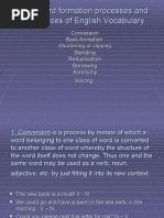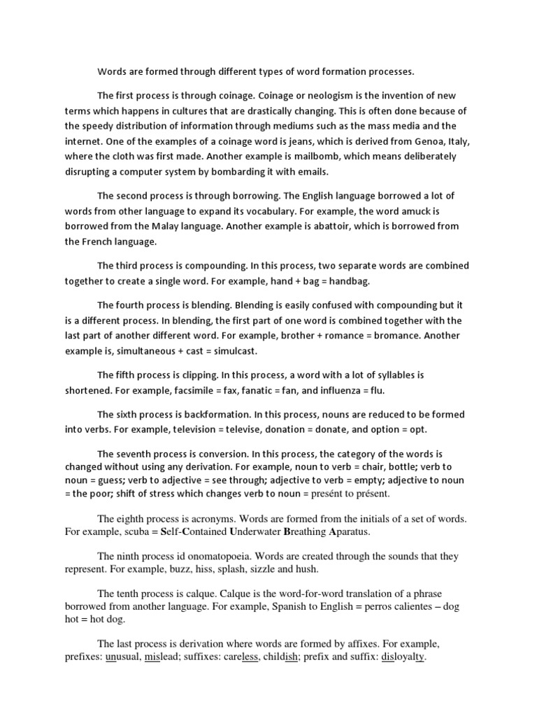 Coinage or neologism is the invention of new terms which happens in cultures that are drastically changing. This is often done because of the speedy distribution of information through mediums such as the mass media and the internet. One of the examples of a coinage word is jeans, which is derived from Genoa, Italy, where the cloth was first made. Another example is mailbomb, which means deliberately disrupting a computer system by bombarding it with emails. The second process is through borrowing. The English language borrowed a lot of words from other language to expand its vocabulary. For example, the word amuck is borrowed from the Malay language. Another example is abattoir, which is borrowed from the French language. The third process is compounding. In this process, two separate words are combined together to create a single word. For example, hand + bag = handbag. The fourth process is blending. Blending is easily confused with compounding but it is a different process. In blending, the first part of one word is combined together with the last part of another different word. For example, brother + romance = bromance. Another example is, simultaneous + cast = simulcast. The fifth process is clipping. In this process, a word with a lot of syllables is shortened. For example, facsimile = fax, fanatic = fan, and influenza = flu. The sixth process is backformation. In this process, nouns are reduced to be formed into verbs. For example, television = televise, donation = donate, and option = opt. The seventh process is conversion. In this process, the category of the words is changed without using any derivation. For example, noun to verb = chair, bottle; verb to noun = guess; verb to adjective = see through; adjective to verb = empty; adjective to noun = the poor; shift of stress which changes verb to noun = presnt to prsent. The eighth process is acronyms. Words are formed from the initials of a set of words. For example, scuba = Self-Contained Underwater Breathing Aparatus. The ninth process id onomatopoeia. Words are created through the sounds that they represent. For example, buzz, hiss, splash, sizzle and hush. The tenth process is calque. Calque is the word-for-word translation of a phrase borrowed from another language. For example, Spanish to English = perros calientes dog hot = hot dog. The last process is derivation where words are formed by affixes. For example, prefixes: unusual, mislead; suffixes: careless, childish; prefix and suffix: disloyalty.