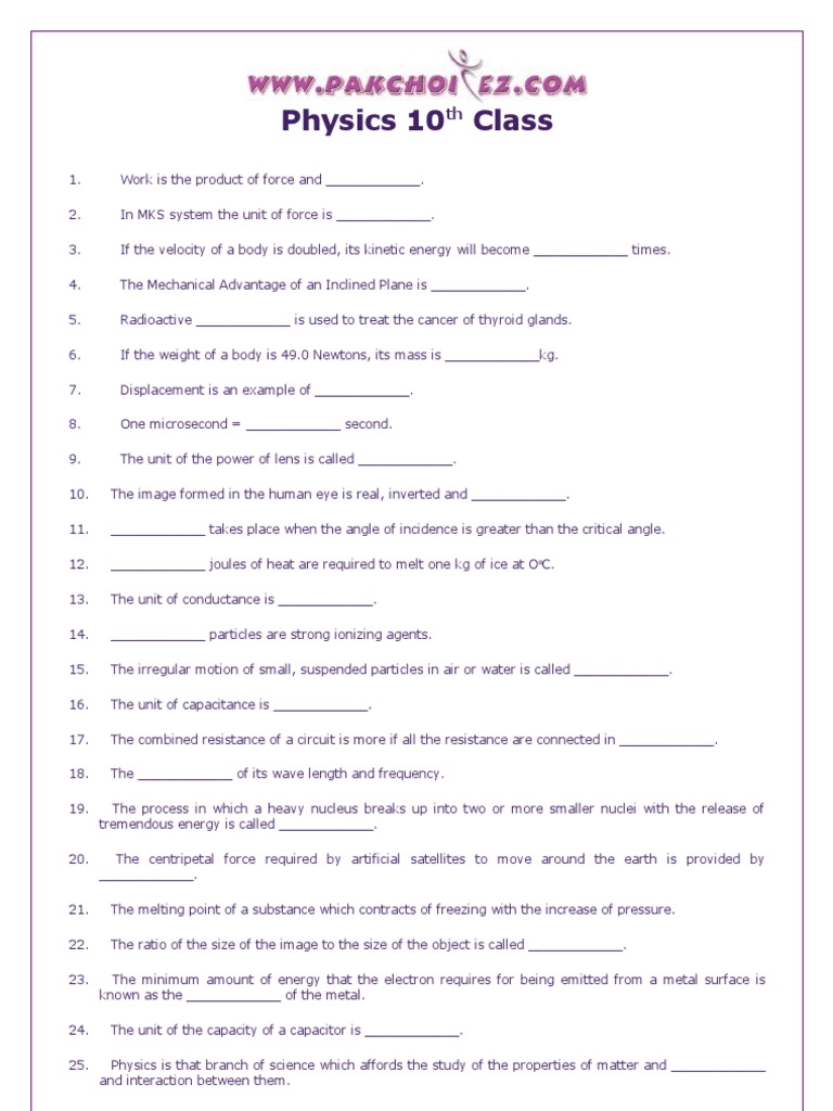 1. 2. 3. 4. 5. 6. 7. 8. 9. 10. 11. 12. 13. 14. 15. 16. 17. 18. 19. Work is the product of force and ____________. In MKS system the unit of force is ____________. If the velocity of a body is doubled, its kinetic energy will become ____________ times. The Mechanical Advantage of an Inclined Plane is ____________. Radioactive ____________ is used to treat the cancer of thyroid glands. If the weight of a body is 49.0 Newtons, its mass is ____________kg. Displacement is an example of ____________. One microsecond = ____________ second. The unit of the power of lens is called ____________. The image formed in the human eye is real, inverted and ____________. ____________ takes place when the angle of incidence is greater than the critical angle. ____________ joules of heat are required to melt one kg of ice at OC. The unit of conductance is ____________. ____________ particles are strong ionizing agents. The irregular motion of small, suspended particles in air or water is called ____________. The unit of capacitance is ____________. The combined resistance of a circuit is more if all the resistance are connected in ____________. The ____________ of its wave length and frequency. The process in which a heavy nucleus breaks up into two or more smaller nuclei with the release of tremendous energy is called ____________. The centripetal force required by artificial satellites to move around the earth is provided by ____________. The melting point of a substance which contracts of freezing with the increase of pressure. The ratio of the size of the image to the size of the object is called ____________. The minimum amount of energy that the electron requires for being emitted from a metal surface is known as the ____________ of the metal. The unit of the capacity of a capacitor is ____________. Physics is that branch of science which affords the study of the properties of matter and ____________ and interaction between them.