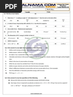 134. A radio wave is produced by a ____________ alternating current. (Low frequency, High frequency, Audio frequency) 135. To produce N-type crystal, germanium may be doped with a substance that is ____________ . (Divalent, Trivalent, Tetravalent, Pentavalent) 136. For forward biasing a PN junction, the positive terminal is connected to ____________ . (P-type crystal, N-type crystal, Neither P or N type crystal) 137. In p-type semi conductor most of current is carried by ____________. (Electrons, Protons, Holes) 138. The number of protons in the nucleus is called ____________. (Avogadro number, Atomic Number, Mass number, Nucleons Number) 139. The emission of rays from the nucleus is called ____________. (Chemical process, Atomic process, Radio-activity, Atomic dispersion) 140. -rays are found to be in ____________. (electromagnatic waves, electrons, fastly moving neutrons, fastly moving helium nucleus) 141. An element whose atoms have same atomic number bu different mass number are called ____________. (Molecule, Secondary element, Isotope,) 142. ____________ is most penetrating. (-rays, -rays, -rays) NUMERICALS Section A 1. A 600 gm iron piece at 100C is dropped into 200 gm of water at 20C. The temperature of the mixture is 41C; find the specific heat of iron. A train is moving with a velocity of 72 km/hr. By applying the brakes a retardation of 0.5 m/sec2 is produced. Find the time it will take to stop. A force of 60 N acts on a body at an angle of 60C with the horizontal. Find its horizontal and vertical components. A brass rod of length 3.0 m at 0C is heated to 100C. What should be its length if the coefficient of linear expansion of brass is 19 x 10-6 C-1. On braking a car of mass 1000 kg travelling at 36 km/h, it comes to rest after a distance of 20 m. Find the average braking force acting on it. A box weighing 200 N is pushed on a horizontal floor. What acceleration will result if a horizontal force of 100 N is applied to the box? Coefficient of sliding friction is 0.4.