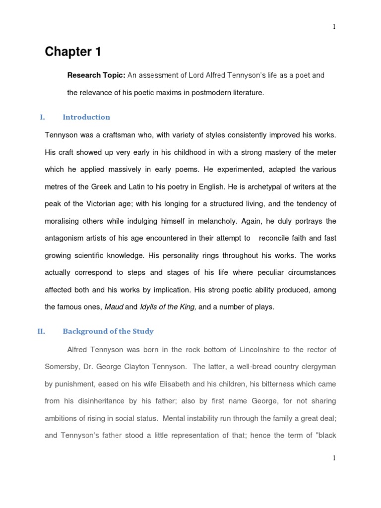 Research Topic: An assessment of Lord Alfred Tennysons life as a poet and the relevance of his poetic maxims in postmodern literature.