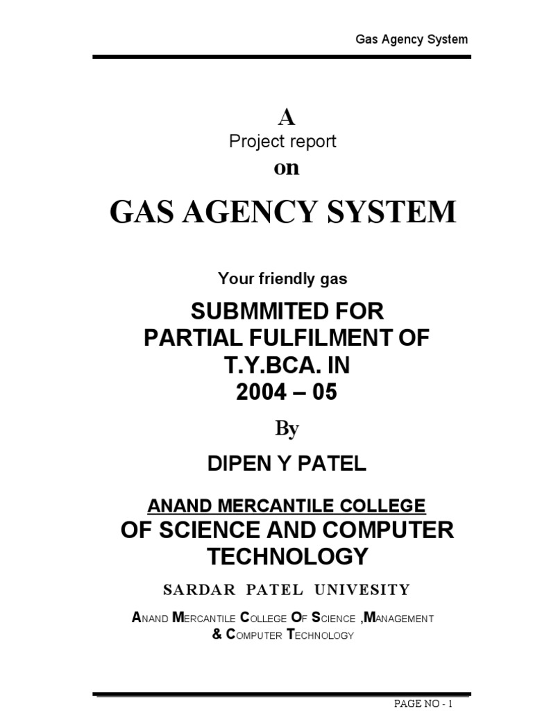 This is to certify that Mr.DIPEN Y PATEL of TYBCA (Seat No ___) has worked on project entitled GAS AGENCY SYSTEM, from JUNE-04 to APRIL-05. This (BCA-309) is in-house project course of three credits.