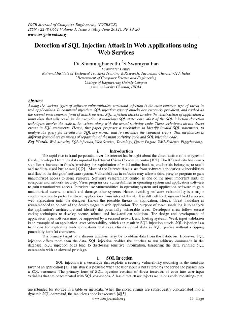 Under such circumstances, if the variables "$username" and "$password" are taken directly from the user's input, the login script can easily be cheated that a valid password has been provided. If the string or = is the password and "abc" is the username, the variables are interpolated and hence the above query would look like this: "SELECT id FROM logins WHERE username = 'abc' and password = '' or '' = ''"; This query will return a row because the final clause is or '' = '' which always evaluate to true (i.e. empty string is always equal to an empty string). An SQL Injection attack has a set of properties, such as assets under threat, vulnerabilities being exploited and attack techniques utilized by threat agents. Attack techniques are the specific means by which a threat agent carries out attacks using malicious code. Threat agents may use many different methods to achieve their goals, often combining several of these sequentially or employing them in different varieties like tautology, end of line Comment, illegal / Logically incorrect query, union query, piggy-backed query, system stored procedure, blind injection and OPENROWSET result retrieval[6][7]. All these threats can be prevented from the web applications by sanitizing the user inputs and validating the query structure. The existing solutions focus on web application attacks in general and are dependent on the applications [8][9]. All the solutions are not placed as a layered approach and are specific to back-end databases and specific to platforms [10][11][12]. This paper presents a different methodology to detect and protect SQL Injection in web applications through independent web services in a layered approach. This paper focuses on the identification of invalid SQL statements, analyzing the query for invalid non-SQL keywords which are not present in database, capturing errors, generalizing the error of illegal and logically incorrect queries, printing outputs, detecting SQL injections and maintaining file system for further references. The model proposed in this paper uses a layered approach by which the main scripting code and SQL injection detection code are separated. Also, SQL validation and detection code is implemented as independent web services. II. Literature Survey Many researchers have contributed in the area of SQL injection. David Morgan [13] describes the concepts of SQL injection, explores the attack vectors, and cites examples for preventing them. Welty [14] describes the nature of SQL errors, various frequencies in which they occur and methods of detecting and correcting them. Johannes and Lam [15] discusses how a website can be defaced through SQL Injection. Prithvi et al. [16] describe the prevention of SQL Injection attacks using the technique of CANDID queries. They initially used the CANDID inputs, then the original inputs and then tested whether the path taken by both queries are the same or any variations do exist. If exist, they detect the SQL Injection. Recent SQL Injection attacks on hundreds of thousands of web sites were hit, including those operated by the UN and UK government [17]. Martin et al. [18] discussed the syntax to prevent injection vulnerabilities in a language-independent way. In their method, a SQL expression is spliced into the final SQL query. Then this query is composed with inserted values at runtime and L- R parsing is done on the entire query for validation. Dimitris and Diomidis [19] implemented a system, which lies in between web application and connectivity driver. In order to secure the application from SQLIAs, the driver will go through a training phase. This involves executing all the SQL queries of the application so that the driver can identify them. Then, the drivers operations can shift into production mode, where the driver takes into account all the trained legitimate queries to prevent SQLIAs by detecting and blocking them. However, it would be appropriate to have SQL validation and injection code independent of the application and environment. XML based web services provides solutions for such systems. Hence, this paper discusses a layered approach based on web services.
