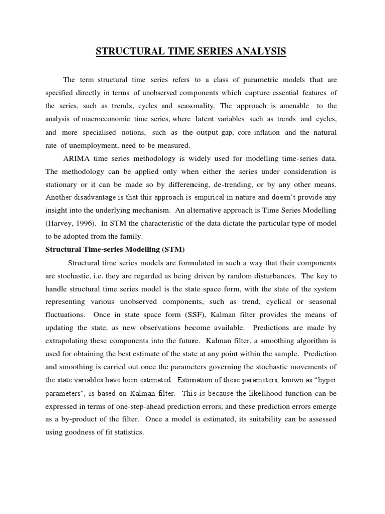 analysis of macroeconomic time series, where latent variables such as trends and cycles, and more specialised notions, such as the output gap, core inflation and the natural rate of unemployment, need to be measured. ARIMA time series methodology is widely used for modelling time-series data. The methodology can be applied only when either the series under consideration is stationary or it can be made so by differencing, de-trending, or by any other means. Another disadvantage is that this approach is empirical in nature and doesnt provide any insight into the underlying mechanism. An alternative approach is Time Series Modelling (Harvey, 1996). In STM the characteristic of the data dictate the particular type of model to be adopted from the family. Structural Time-series Modelling (STM) Structural time series models are formulated in such a way that their components are stochastic, i.e. they are regarded as being driven by random disturbances. The key to handle structural time series model is the state space form, with the state of the system representing various unobserved components, such as trend, cyclical or seasonal fluctuations. Once in state space form (SSF), Kalman filter provides the means of Predictions are made by