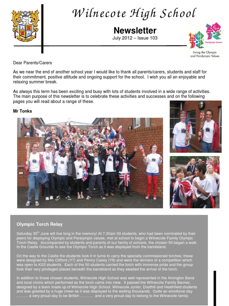 Dear Parents/Carers As we near the end of another school year I would like to thank all parents/carers, students and staff for their commitment, positive attitude and ongoing support for the school. I wish you all an enjoyable and relaxing summer break. As always this term has been exciting and busy with lots of students involved in a wide range of activities. The main purpose of this newsletter is to celebrate these activities and successes and on the following pages you will read about a range of these. Mr Tonks