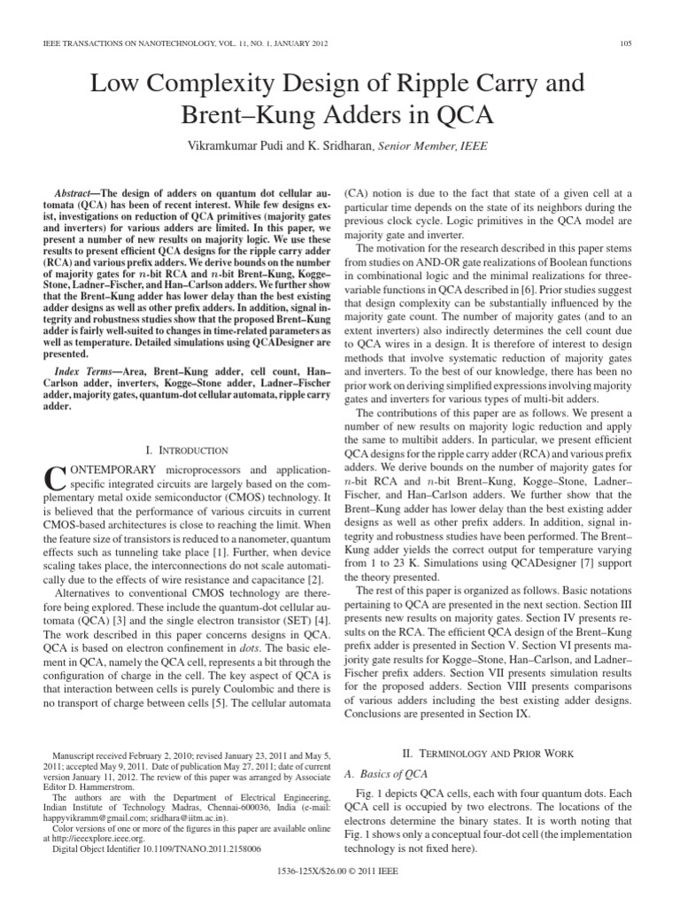 [32] P. M. Kogge and H. S. Stone, A parallel algorithm for the efcient solution of a general class of recurrent equations, IEEE Trans. Comput., vol. C-22, no. 8, pp. 786793, Aug. 1973. [33] R. E. Ladner and M. J. Fischer, Parallel prex computation, J. Assoc. Comput. Mach., vol. 27, no. 4, pp. 831838, Oct. 1980. [34] R. P. Brent and H. T. Kung, A regular layout for parallel adders, IEEE Trans. Comput., vol. C-31, no. 3, pp. 260264, Mar. 1982. [35] T. Han and D. A. Carlson, Fast area-efcient VLSI adders, in Proc. 8th IEEE Symp. Comput. Arithmet., 1987, pp. 4956. [36] V. Pudi and K. Sridharan, Efcient design of a hybrid adder in quantumdot cellular automata, IEEE Trans. VLSI Syst., 2010, to be published. [37] K. Walus, G. Schulhof, and G. Jullien, Implementation of a simulation engine for clocked molecular QCA, in Proc. IEEE Can. Conf. Electr. Comput. Eng., May 2006, pp. 21282131. [38] G. Schulhof, K. Walus, and G. A. Jullien, Simulation of random cell displacements in QCA, ACM J. Emerg. Technol. Comput. Syst., vol. 3, no. 1, pp. 114, 2007.