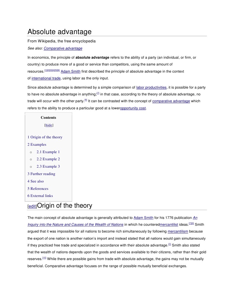 See also: Comparative advantage In economics, the principle of absolute advantage refers to the ability of a party (an individual, or firm, or country) to produce more of a good or service than competitors, using the same amount of resources.[1][2][3][4][5][6] Adam Smith first described the principle of absolute advantage in the context of international trade, using labor as the only input. Since absolute advantage is determined by a simple comparison of labor productivities, it is possible for a party to have no absolute advantage in anything;[7] in that case, according to the theory of absolute advantage, no trade will occur with the other party.[8] It can be contrasted with the concept of comparative advantage which refers to the ability to produce a particular good at a loweropportunity cost.