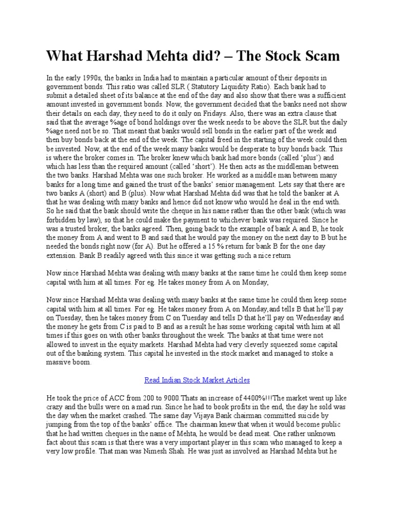 In the early 1990s, the banks in India had to maintain a particular amount of their deposits in government bonds. This ratio was called SLR ( Statutory Liquidity Ratio). Each bank had to submit a detailed sheet of its balance at the end of the day and also show that there was a sufficient amount invested in government bonds. Now, the government decided that the banks need not show their details on each day, they need to do it only on Fridays. Also, there was an extra clause that said that the average %age of bond holdings over the week needs to be above the SLR but the daily %age need not be so. That meant that banks would sell bonds in the earlier part of the week and then buy bonds back at the end of the week. The capital freed in the starting of the week could then be invested. Now, at the end of the week many banks would be desperate to buy bonds back. This is where the broker comes in. The broker knew which bank had more bonds (called plus) and which has less than the required amount (called short). He then acts as the middleman between the two banks. Harshad Mehta was one such broker. He worked as a middle man between many banks for a long time and gained the trust of the banks senior management. Lets say that there are two banks A (short) and B (plus). Now what Harshad Mehta did was that he told the banker at A that he was dealing with many banks and hence did not know who would he deal in the end with. So he said that the bank should write the cheque in his name rather than the other bank (which was forbidden by law), so that he could make the payment to whichever bank was required. Since he was a trusted broker, the banks agreed. Then, going back to the example of bank A and B, he took the money from A and went to B and said that he would pay the money on the next day to B but he needed the bonds right now (for A). But he offered a 15 % return for bank B for the one day extension. Bank B readily agreed with this since it was getting such a nice return Now since Harshad Mehta was dealing with many banks at the same time he could then keep some capital with him at all times. For eg. He takes money from A on Monday, Now since Harshad Mehta was dealing with many banks at the same time he could then keep some capital with him at all times. For eg. He takes money from A on Monday,and tells B that hell pay on Tuesday, then he takes money from C on Tuesday and tells D that hell pay on Wednesday and the money he gets from C is paid to B and as a result he has some working capital with him at all times if this goes on with other banks throughout the week. The banks at that time were not allowed to invest in the equity markets. Harshad Mehta had very cleverly squeezed some capital out of the banking system. This capital he invested in the stock market and managed to stoke a massive boom. Read Indian Stock Market Articles He took the price of ACC from 200 to 9000.Thats an increase of 4400%!!!The market went up like crazy and the bulls were on a mad run. Since he had to book profits in the end, the day he sold was the day when the market crashed. The same day Vijaya Bank chairman committed suicide by jumping from the top of the banks office. The chairman knew that when it would become public that he had written cheques in the name of Mehta, he would be dead meat. One rather unknown fact about this scam is that there was a very important player in this scam who managed to keep a very low profile. That man was Nimesh Shah. He was just as involved as Harshad Mehta but he