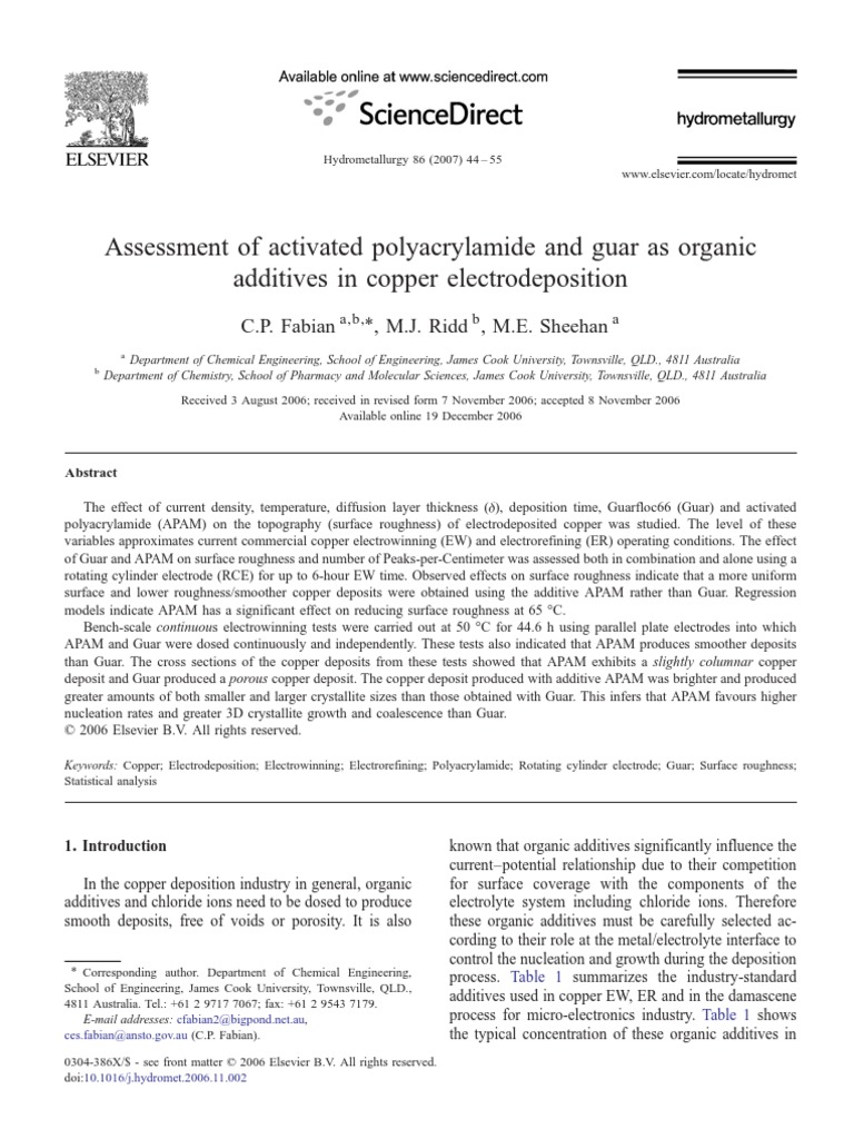 Arvia, A.J., Carrozza, J.S.W., 1962. Mass transfer in the electrolysis of CuSO4H2SO4 in aqueous solutions under limiting current and forced convection employing a cylindrical cell with rotating electrodes. Electrochimica Acta 7, 6578. Barkey, D., Muller, R., Tobias, C., 1989. Roughness development in metal electrodeposition I. Experimental results. Journal of the Electrochemical Society 138 (8), 21992207. Budevski, E., Staikov, G., Lorenz, W., 1996. Electrochemical Phase Formation and Growth an Introduction to the Initial Stages of Metal Deposition. VCH, New York. Fabian, C., 2005. Copper electrodeposition in the presence of guar or activated polyacrylamide. PhD Thesis, James Cook University, Australia. Fabian, C., Ridd, M., Ness, S., Lancaster, T., Griffin, G., 2003. Determination of crystallite size and surface roughness of copper deposits for electrowinning in the presence of an organic additive. In: Young, C.A., Anderson, C.G., Dreisinger, D.B., Harris, B., James, A. (Eds.), Hydrometallurgy. The Minerals Metals and Materials Society (TMS), Warrendale, pp. 12331245. Fabian, C., Mandin, P., Ridd, M.J., Sheehan, M., 2006a. Hydrodynamic modelling of copper electrodeposition at a vertical rotating cylinder electrode. In: Woods, R., Doyle, F.M., Kelsall, G.H. (Eds.), Electrochemistry in Mineral and Metal Processing VII. The Electrochemical Society Inc., Denver, CO, pp. 303315. Fabian, C., Ridd, M.J., Sheehan, M.E., 2006b. Rotating cylinder electrode study of the effect of activated polyacrylamide on surface roughness of electrodeposited copper. Hydrometallurgy 84 (34), 256263. Halverson, F., Lancaster, J., O'Connor, M., 1985. Sequence distribution of carboxyl groups in hydrolyzed polyacrylamide. Macromolecules 18 (6), 11391144. Ilgar, E., O'Keefe, T., 1997. Surface roughening of electrowon copper in the presence of chloride ions. In: Dreisinger, D. (Ed.), Aqueous Electrotechnologies: Progress in Theory and Practice. The Minerals Metals and Materials Society (TMS), Warrendale, pp. 5162. Klug, H., Alexander, L., 1974. X-ray Diffraction Procedures for Polycrystalline and Amorphous Materials. John Wiley & Sons, Sydney. Langner, B.E., Stantke, P., Reinking, E.F., 1989. Method of Measuring the Effective Inhibitor Concentration During a Deposition Process of Metal from Aqueous Electrolytes and Test Apparatus Therefore. Norddeutsche Affinerie Aktiengesellschaft, Hamburg, DE, p. 11. Mahr, 2002. M1 Mahr Perthometer Operating Manual. Mark, H., Gaylord, N., Bikales, N., 1969. Encyclopedia of Polymer Science and Technology, vol. 11. Wiley-Interscience, New York, pp. 401420. Mathe, M.K., Cox, S.M., Venkatasamy, V., Happek, U., Stickney, J.L., 2005. Formation of HgSe thin films using electrochemical atomic layer epitaxy. Journal of the Electrochemical Society 152 (11), C751C755. MathSoft Engineering and Education, I, 2004. Mathcad. Montgomery, D.C., 2001. Design and Analysis of Experiments. John Wiley & Sons.