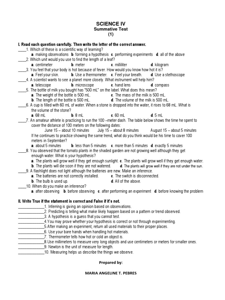 Summative Test (1) I. Read each question carefully. Then write the letter of the correct answer. ____1. Which of these is a scientific way of learning? a. making observations b. forming a hypothesis c. performing experiments d. all of the above ____2. Which unit would you use to find the length of a leaf? a. centimeter b. meter c. milliliter d. kilogram ____3. You feel that your body is hot because of fever. How would you know how hot it is? a. Feel your skin. b. Use a thermometer. c. Feel your breath. d. Use a stethoscope ____4. A scientist wants to see a planet more closely. What instrument will help him? a. telescope b. microscope c. hand lens d. compass ____5. The bottle of milk you bought has 500 mL on the label. What does this mean? a. The weight of the bottle is 500 mL. c. The mass of the milk is 500 mL. b. The length of the bottle is 500 mL. d. The volume of the milk is 500 mL. ____6. A cup is filled with 60 mL of water. When a stone is dropped into the water, it rises to 68 mL. What is the volume of the stone? a. 68 mL b. 8 mL c. 60 mL d. 5 mL ____7. An amateur athlete is practicing to run the 100 meter dash. The table below shows the time he spent to cover the distance of 100 meters on the following dates: June 15 about 10 minutes July 15 about 8 minutes August 15 about 5 minutes If he continues to practice showing the same trend, what do you think would be his time to cover 100 meters in September? a. about 5 minutes b. less than 5 minutes c. more than 5 minutes d. exactly 5 minutes ____8. You observed that the tomato plants in the shaded garden are not growing well although they get enough water. What is your hypothesis? a. The plants will grow well if they get enough sunlight. c. The plants will grow well if they get enough water. b. The plants will die soon if they are not watered. d. The plants will grow well if they are not under the sun. ____9. A flashlight does not light although the batteries are new. Make an inference. a. The batteries are not correctly installed. c. The switch is disconnected. b. The bulb is used up. d. All of the above. ____10. When do you make an inference? a. after observing b. before observing c. after performing an experiment d. before knowing the problem II. Write True if the statement is correct and False if its not. _____________1. Inferring is giving an opinion based on observations. _____________2. Predicting is telling what make likely happen based on a pattern or trend observed. _____________3. A hypothesis is a guess that you cannot test. _____________4.You may prove whether your hypothesis is correct or not through experimenting. _____________5.After making an experiment, return all used materials to their proper places. _____________6. Use your bare hands when handling hot materials. _____________7. Thermometer tells how hot or cold an object is. _____________8.Use millimeters to measure very long objects and use centimeters or meters for smaller ones. _____________9. Newton is the unit of measure for length. _____________10. Measuring helps us describe the things we observe. Prepared by: MARIA ANGELINE T. PEBRES