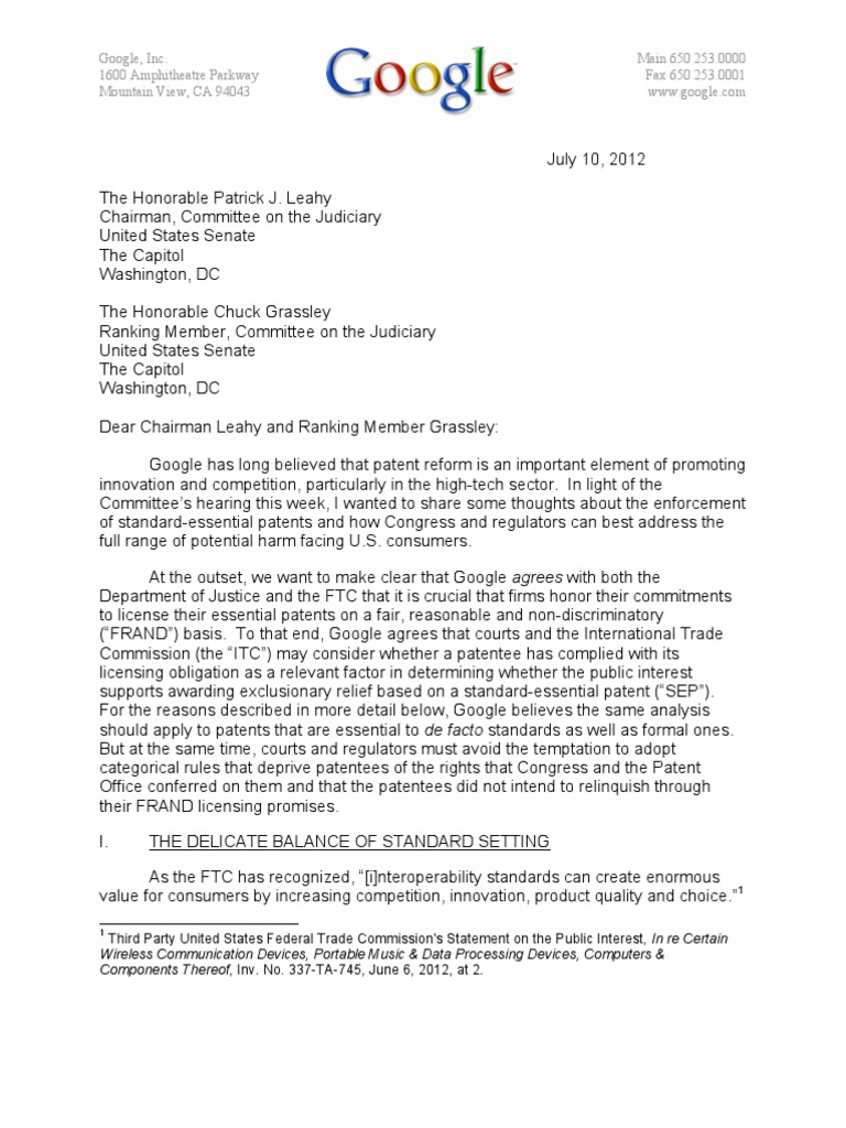 July 10, 2012 The Honorable Patrick J. Leahy Chairman, Committee on the Judiciary United States Senate The Capitol Washington, DC The Honorable Chuck Grassley Ranking Member, Committee on the Judiciary United States Senate The Capitol Washington, DC Dear Chairman Leahy and Ranking Member Grassley: Google has long believed that patent reform is an important element of promoting innovation and competition, particularly in the high-tech sector. In light of the Committees hearing this week, I wanted to share some thoughts about the enforcement of standard-essential patents and how Congress and regulators can best address the full range of potential harm facing U.S. consumers. At the outset, we want to make clear that Google agrees with both the Department of Justice and the FTC that it is crucial that firms honor their commitments to license their essential patents on a fair, reasonable and non-discriminatory (FRAND) basis. To that end, Google agrees that courts and the International Trade Commission (the ITC) may consider whether a patentee has complied with its licensing obligation as a relevant factor in determining whether the public interest supports awarding exclusionary relief based on a standard-essential patent (SEP). For the reasons described in more detail below, Google believes the same analysis should apply to patents that are essential to de facto standards as well as formal ones. But at the same time, courts and regulators must avoid the temptation to adopt categorical rules that deprive patentees of the rights that Congress and the Patent Office conferred on them and that the patentees did not intend to relinquish through their FRAND licensing promises. I. THE DELICATE BALANCE OF STANDARD SETTING