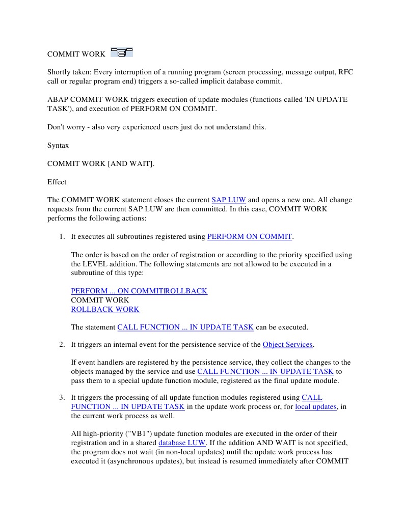 program end) triggers a so-called implicit database commit. ABAP COMMIT WORK triggers execution of update modules (functions called 'IN UPDATE TASK'), and execution of PERFORM ON COMMIT. Don't worry - also very experienced users just do not understand this. Syntax COMMIT WORK [AND WAIT]. Effect The COMMIT WORK statement closes the current SAP LUW and opens a new one. All change requests from the current SAP LUW are then committed. In this case, COMMIT WORK performs the following actions: 1. It executes all subroutines registered using PERFORM ON COMMIT. The order is based on the order of registration or according to the priority specified using the LEVEL addition. The following statements are not allowed to be executed in a subroutine of this type: PERFORM ... ON COMMIT|ROLLBACK COMMIT WORK ROLLBACK WORK The statement CALL FUNCTION ... IN UPDATE TASK can be executed. 2. It triggers an internal event for the persistence service of the Object Services. If event handlers are registered by the persistence service, they collect the changes to the objects managed by the service and use CALL FUNCTION ... IN UPDATE TASK to pass them to a special update function module, registered as the final update module. 3. It triggers the processing of all update function modules registered using CALL FUNCTION ... IN UPDATE TASK in the update work process or, for local updates, in the current work process as well. All high-priority ("VB1") update function modules are executed in the order of their registration and in a shared database LUW. If the addition AND WAIT is not specified, the program does not wait (in non-local updates) until the update work process has executed it (asynchronous updates), but instead is resumed immediately after COMMIT
