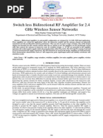 This document describes a demoboard for the upcoming 2.4GHz Industrial-Scientific-Medical (ISM) band for applications like wireless communication, LAN and video/TV signal transmission. It covers a power amplifier (PA) for transmitting, a low noise amplifier (LNA) for receiving and an RF switch for multiplexing these two main circuits to a third antenna terminal. This document illustrates applications information, standards, description of the board itself and a selection of the design procedure. Modern IC processes make it possible to integrate the main receiver (RX) and transmitter (TX) functions into a one-chip solution. The actual highly integrated circuits (IC) doesnt reach the receiver front-end performance of noise and linearity compared with an LNA implemented by an optimised discrete transistor or Monolithic Microwave Integrated Circuit (MMIC). Due to thermal radiation limitations of the IC package, only low output transmission power is supported. These IC limitations do reduce the receiver sensitivity itself and the RF power arrival at the other RF-link member. The practical result is a shorter distance between the users. This 2.4GHz generic front-end demoboard was deigned for improving the ICs noise and output power for expanded operation distance. The following diagram illustrates the front-end board working together with a transmitter IC. This general front-end is not designed for a specific application or standard.