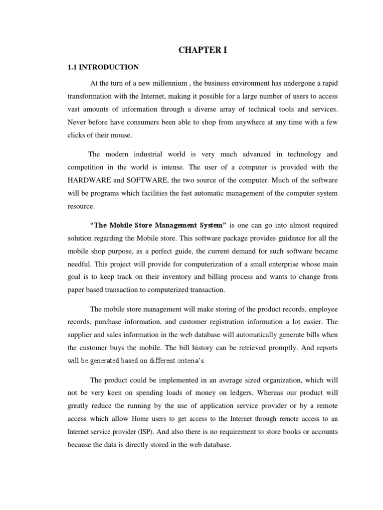 1.1 INTRODUCTION At the turn of a new millennium , the business environment has undergone a rapid transformation with the Internet, making it possible for a large number of users to access vast amounts of information through a diverse array of technical tools and services. Never before have consumers been able to shop from anywhere at any time with a few clicks of their mouse. The modern industrial world is very much advanced in technology and competition in the world is intense. The user of a computer is provided with the HARDWARE and SOFTWARE, the two source of the computer. Much of the software will be programs which facilities the fast automatic management of the computer system resource. The Mobile Store Management System is one can go into almost required solution regarding the Mobile store. This software package provides guidance for all the mobile shop purpose, as a perfect guide, the current demand for such software became needful. This project will provide for computerization of a small enterprise whose main goal is to keep track on their inventory and billing process and wants to change from paper based transaction to computerized transaction. The mobile store management will make storing of the product records, employee records, purchase information, and customer registration information a lot easier. The supplier and sales information in the web database will automatically generate bills when the customer buys the mobile. The bill history can be retrieved promptly. And reports will be generated based on different criterias. The product could be implemented in an average sized organization, which will not be very keen on spending loads of money on ledgers. Whereas our product will greatly reduce the running by the use of application service provider or by a remote access which allow Home users to get access to the Internet through remote access to an