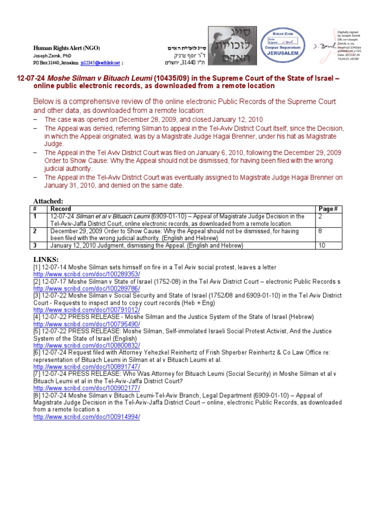 - The Appeal in the Tel-Aviv District Court was eventually assigned to Magistrate Judge Hagai Brenner on January 31, 2010, and denied on the same date.